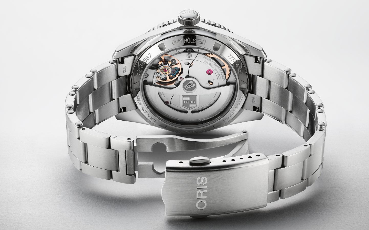 Górna powierzchnia uszu jest szczotkowana, a boki koperty wypolerowano na wysoki połysk. Różnicą wobec dotychczasowych modeli Orisa jest zastosowanie obracanej w obu kierunkach lunety, o czym wspomniałem wcześniej. Luneta ma aluminiową wkładką na której naniesiono 12-godzinną skalę określającą czas w drugiej strefie. Odwracając zegarek widzimy wkręcany, przeszklony dekiel, przez który obserwujemy nowocześnie wykończony mechanizm Orisa.