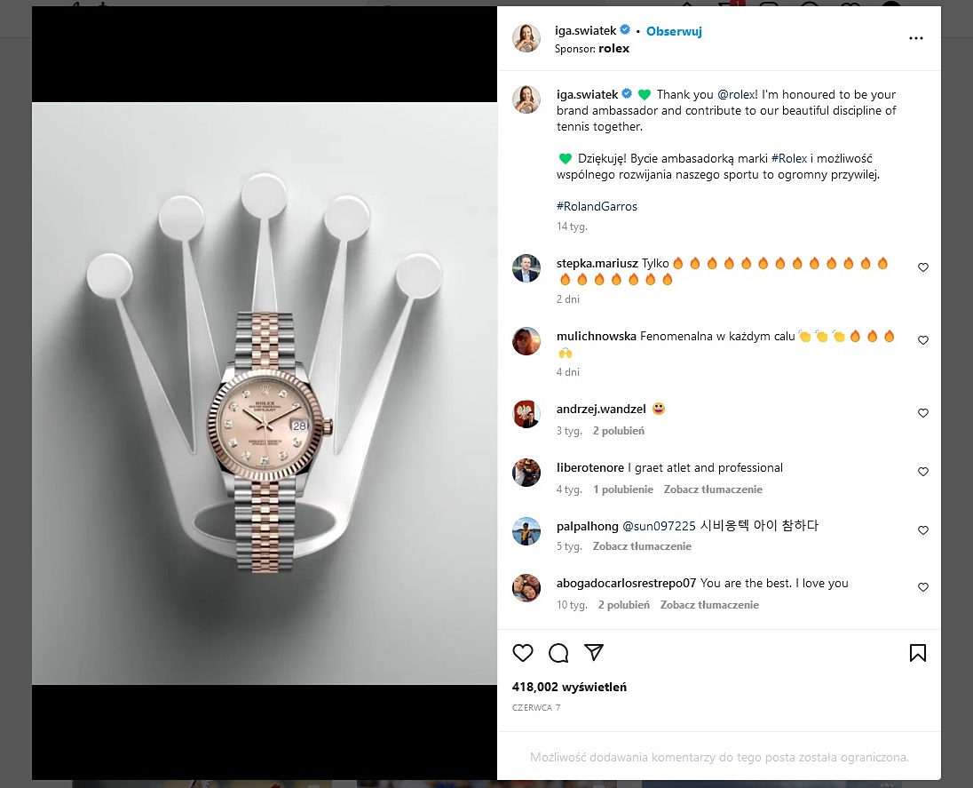 Niemniej Iga znalazła się w wyjątkowym gronie najlepszych tenisistów i tenisistek świata, którzy - jak to sama napisała - są wspólnie w „rodzinie Rolex”. Może to słowa nieco na wyrost, ale szwajcarska firma zegarkowa podkreśla, że będąc rodzinnym przedsiębiorstwem chce, aby sportowcy z którymi współpracuje, także czuli się jak w rodzinie. A ta rodzina to chociażby: Roger Federer, Dominic Thiem, Stefanos Tsitsipas, Garbine Muguruza, Angelique Kerber.