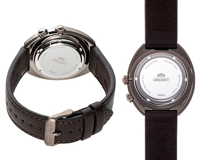 Dodatkowo na godzinie 3. umieszczono dwa okienka datownika ze wskazaniami dni miesiąca bardziej na zewnątrz, i bliżej środka - w szerszym okienku - wskazaniem dni tygodnia. Pod godziną 12. widoczne jest spore logo marki Orient, czyli wizerunek dwóch lwów podtrzymujących tarczę ze stylizowaną literą „O”. W tym miejscu zmieszczono jeszcze także informację o rodzaju naciągu sprężyny napędowej zastosowanego mechanizmu. Po przeciwnej stronie jest informacja o klasie wodoszczelności, która wynosi aż 200 m. Zestaw wskazówek to dwa wyraziste ramiona o polerowanej powierzchni, z nałożonymi paskami masy świecącej. Sekundnik jest prosty i delikatny.