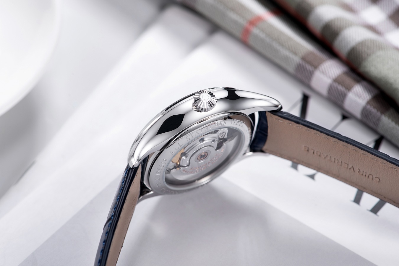 Koronka Aerowatch Les Grandes Classiques Automatic umieszczona na godzinie 3. ma kształt lekko spłaszczonego brylantu z nacięciami na bokach. Ona też wpisuje się w ogólną, klasyczną stylistykę zegarka. Wciskany dekiel to polerowany stalowy pierścień o zaokrąglonym kształcie, z wygrawerowanymi podstawowymi informacjami o modelu zegarku.