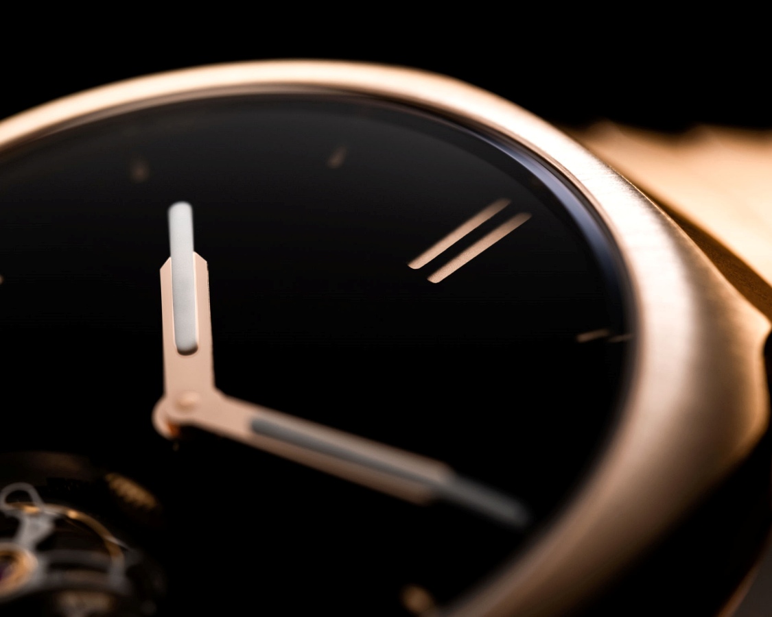 Mechanizm z tourbillonem podkreśla indywidualny charakter tego nowego, minimalistycznego a zarazem ultranowoczesnego zegarka mechanicznego.