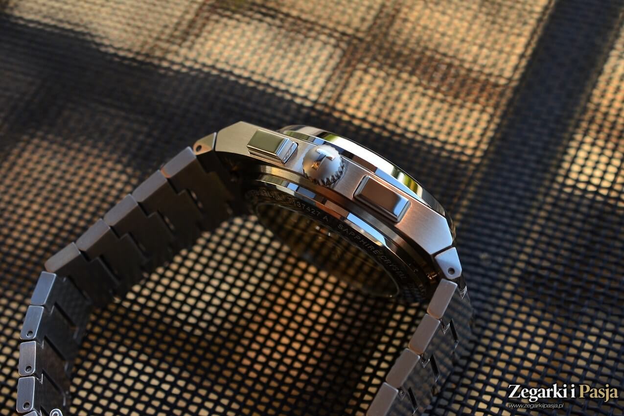 Koperta, mówiąc nieco potocznie, to „kawał stali”. Mechaniczne serce z automatycznym naciągiem sprężyny oznacza z reguły spore rozmiary, szczególnie przy określonej stylistyce. Chodzi głównie o jej grubość, ze względu na dodatkowe wskazania, jak również sam mechanizm, zazwyczaj grubszy. Zegarek ma nieco poniżej 15 mm grubości i 42 mm średnicy. To 2 mm więcej niż wersja PRX bez stopera, ale dzięki temu nieco równoważona jest grubość.