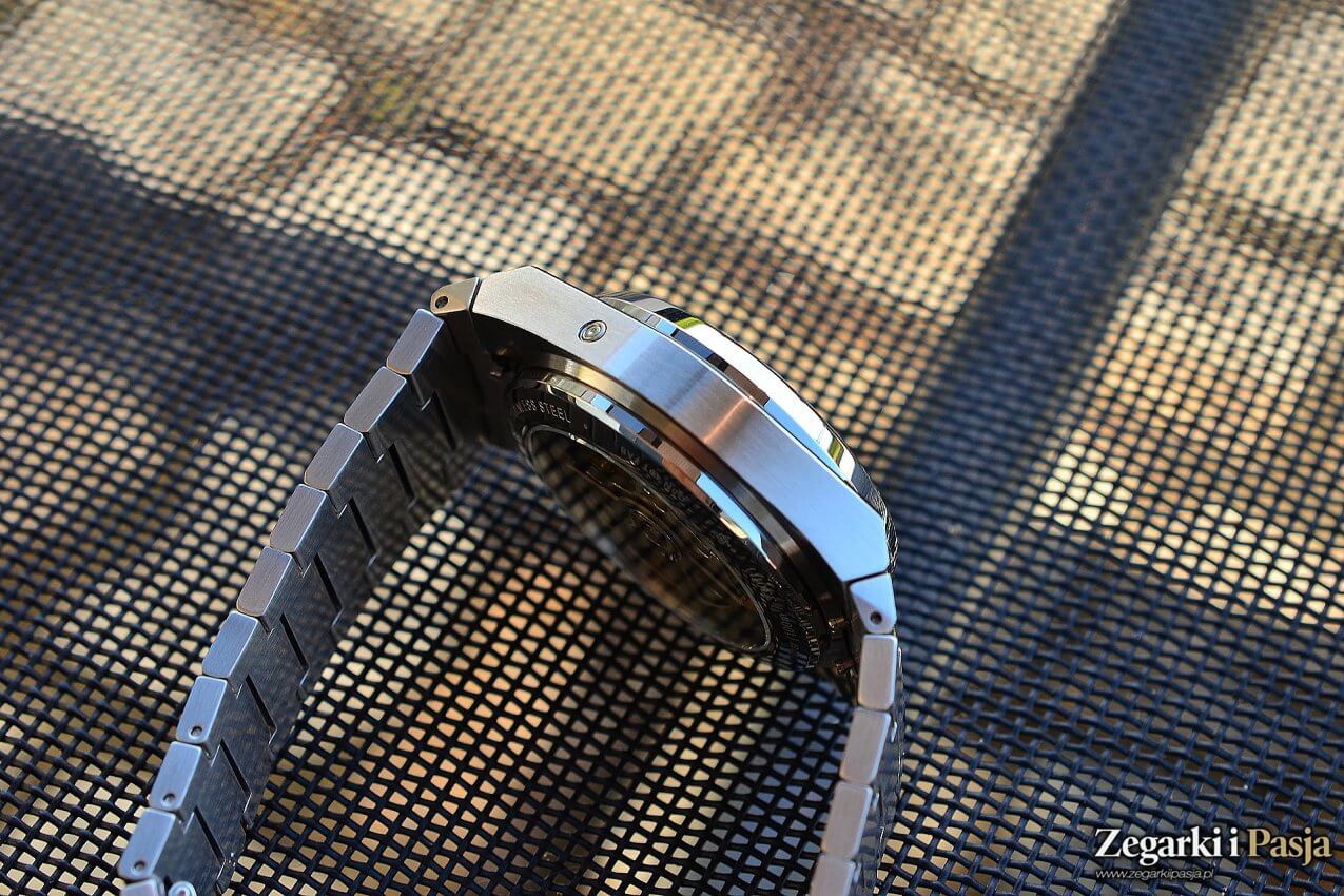 Zestawienie wszystkich podanych wymiarów robi wrażenie „na papierze”, a to, co widzimy – wspomniana masywność, jest tylko wrażeniem wizualnym. Z drugiej strony, koperta wraz z bransoletą mają swoją wagę, więc zegarek ten na pewno nie można nazwać filigranowym.