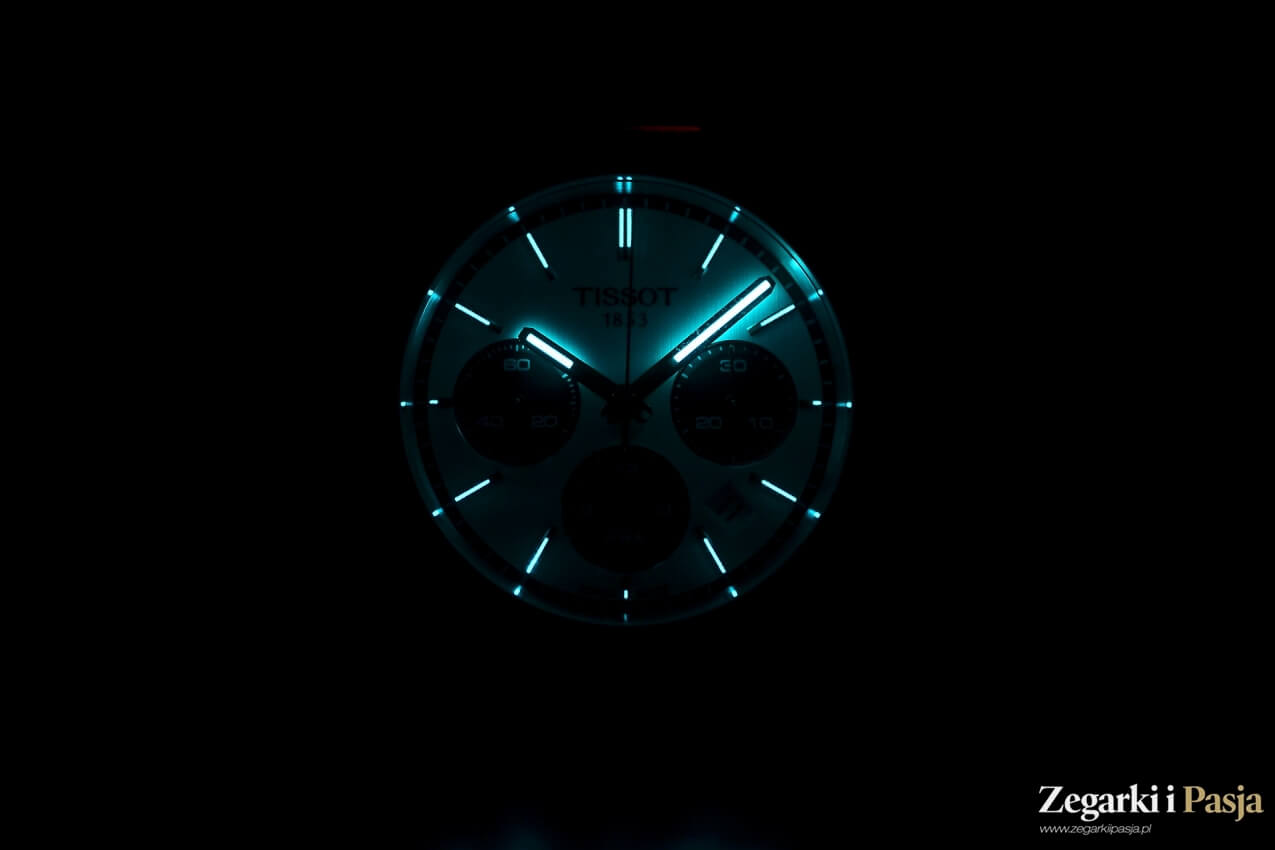 Jeśli chodzi o tarcze Tissot PRX Chronograph Automatic to wersja, którą otrzymaliśmy do testów, ma ją w kolorze jasnym. Srebrzysta powierzchnia prezentuje się atrakcyjnie i wyraźnie widać na niej zdobienie w postaci pionowego szczotkowania, które atrakcyjnie mieni się, gdy pada na nią światło. To nieco surowy, ale atrakcyjny widok.