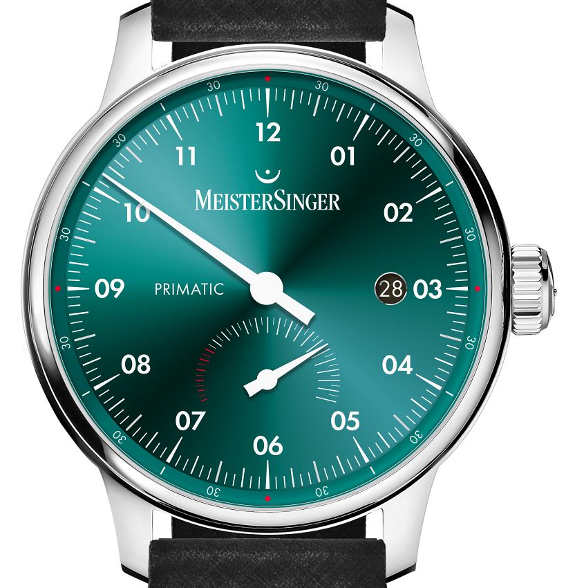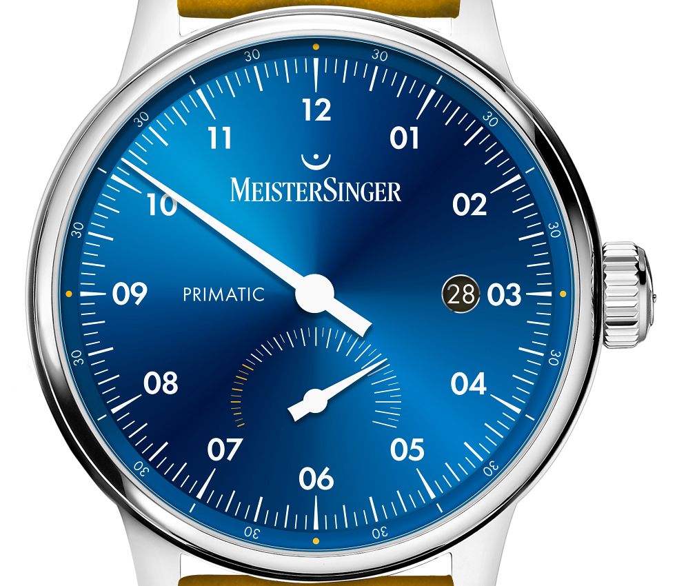 Zupełnie nowy model MeisterSinger Primatic szczyci się czystą formą, równowagą stylistyczną typową dla produktów tej niemieckiej marki. Duża długa wskazówka w formie igły, z ostrym zakończeniem i przeciwwagą, pokazuje czas jak zwykle, na drobnej 5-minutowej skali.