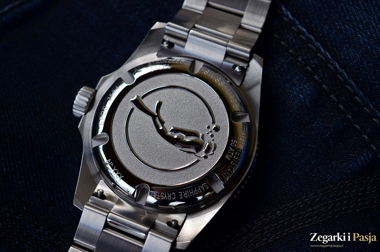 Centralna część dekla jest wydzielona poprzez lekkie zagłębienie, oraz wykończenie powierzchni piaskowaniem o wyrazistym ziarnie. Na tak przygotowanym tle widzimy, w dodatkowym, lśniącym i lekko wystającym okręgu, wizerunek płynącego nurka. To stylizowana postać, lekko wystająca, wypukła, dająca wizualnie odczucie trójwymiarowości. Taka kompozycja daje atrakcyjny, przyjemny dla oka dekiel nurkowego zegarka. Spód koperty jest okrężne szczotkowany.