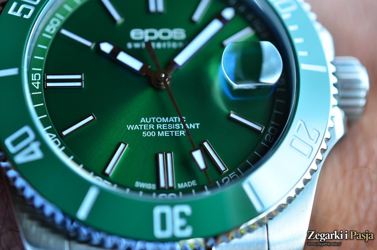 Powierzchnia tarczy jest przyozdobiona szlifem słonecznym, który - gdy pada na nią światło – gwarantuje widok przyjemny dla oglądającego zegarek, dzięki wzbudzanej grze świetlnych refleksów. Na samej krawędzi tarczy jest nałożony wąski pierścień, także w kolorze zielonym, na którym nadrukowano białym lakierem podziałkę minutową. To wąskie, ale dobrze widoczne oznaczenia, co 5 prezentowane w postaci cyfr arabskich. Pod każdym z cyfrowych oznaczeń umieszczono na tarczy nakładany indeks. To podłużne, wąskie, długie elementy. Każdy znacznik jest tak wykonany, że od czołowej części widzimy wąską, polerowaną ramkę, która okala przestrzeń wypełnioną białą masą luminescencyjną. To zapewne SuperlumiNova BGW 9, która po naświetleniu emituje niebieskie światło.