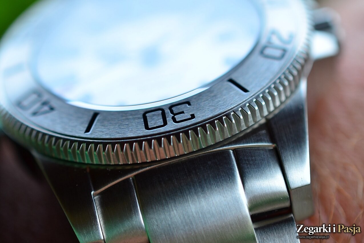 Wspomniana wyjątkowość to materiał z jakiego wkładka jest wykonana. Najczęściej stosuje się aluminium, akryl, lub ceramikę. Są zegarki, gdzie zastosowano szafir, ale też takie, gdzie luneta jest wykonana ze standardowej stali. W recenzowanym zegarku jest nieco inaczej.