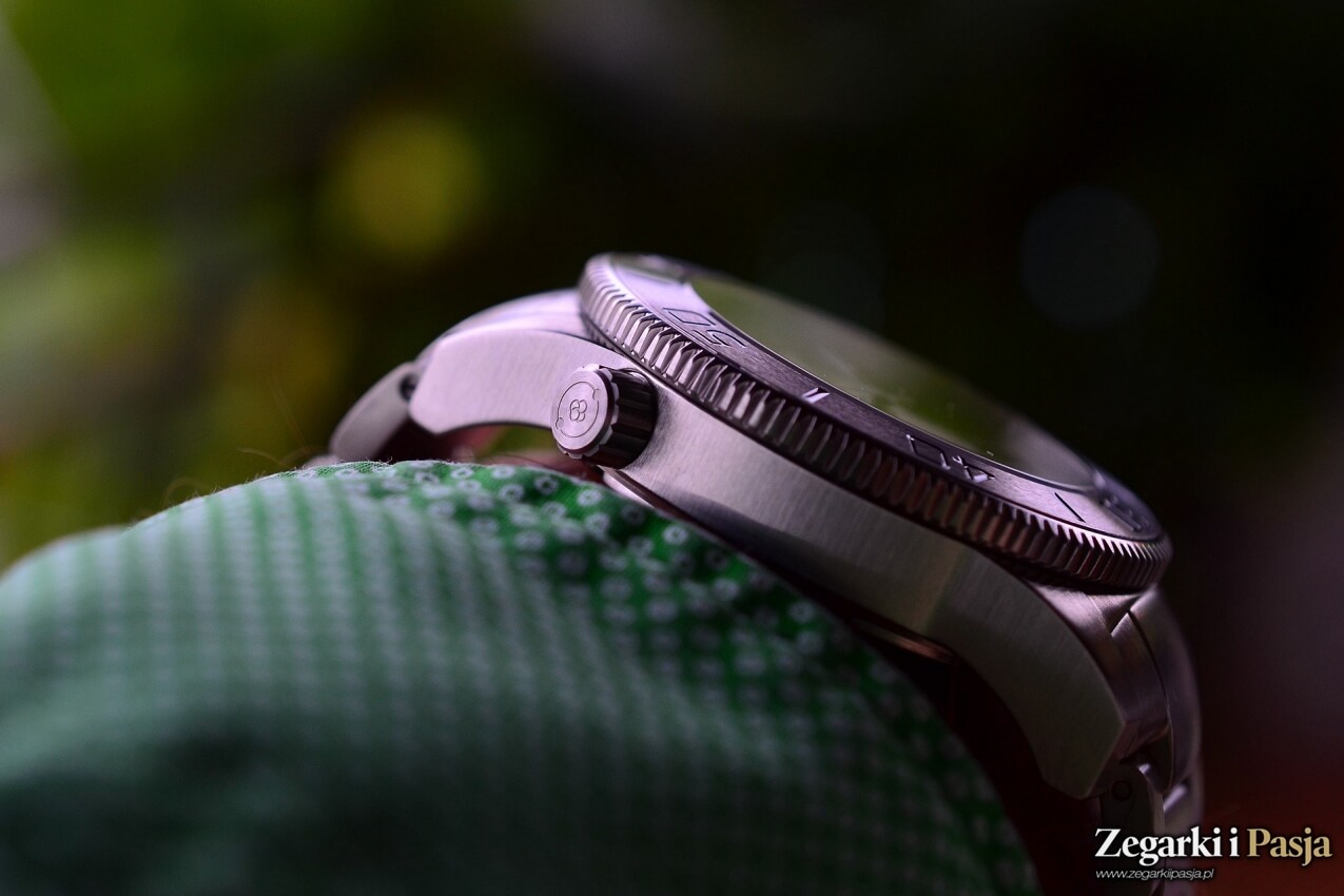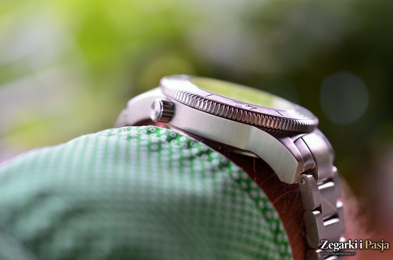 Koperta ma wyraźnie widoczne krawędzie, a dzięki szczotkowaniu jej powierzchni zegarek nabiera „toolwatchowego”, technicznego charakteru, co doskonale pasuje do divera.