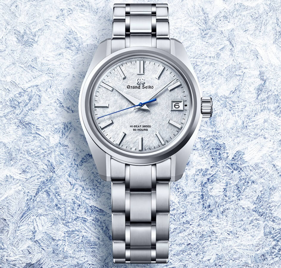 Równie efektowne są płaskie, ciężkie wskazówki typu dauphine, które wyróżniają się fazowanymi krawędziami. Jest to jedna z sygnatur marki Grand Seiko, znak rozpoznawczy, którego konkurencja praktycznie nie stosuje. Kolejnym jest wzór widoczny na delikatnie błękitnej tarczy, inspirowany teksturą topniejącego wiosną śniegu na szczycie góry Iwate położonym 2038 metrów n.p.m. Ten wciąż aktywny wulkan góruje nad Grand Seiko Studio w Shinzukuishi, i stale – jak widać - dostarcza pomysłów projektantom w nim pracującym.