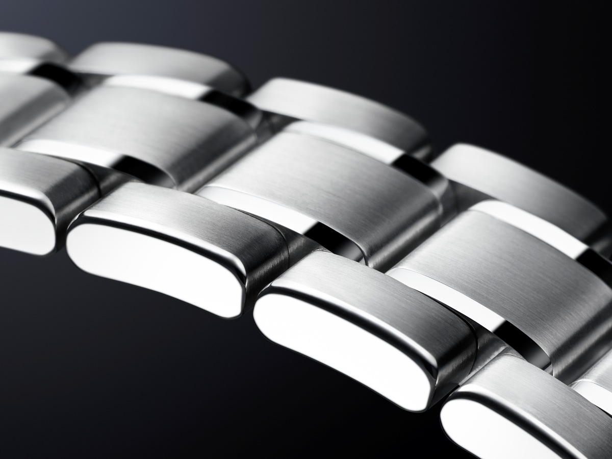 Z Ever-Brilliant Steel wykonano również masywną, trzyrzędową bransoletę z dzielonymi elementami łączącymi. Wąskie elementy wypolerowano, co wizualnie potęguje kontrast między nimi a szlifowanymi częściami.
