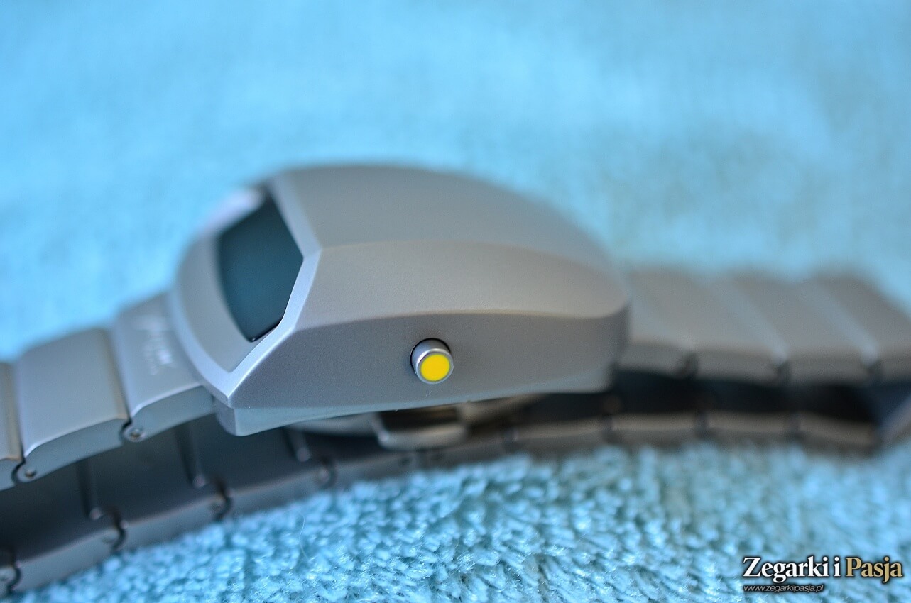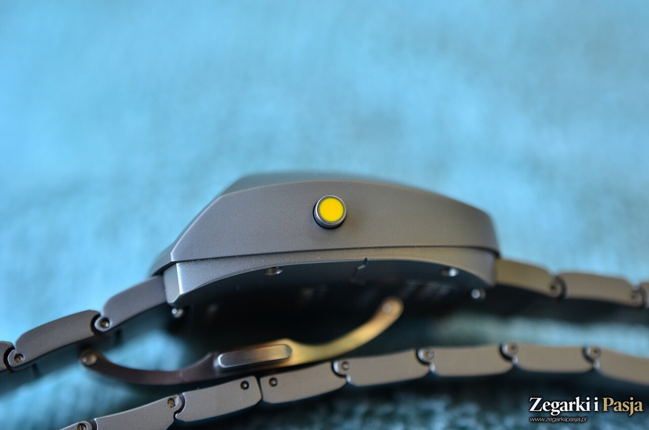 Jak pisałem wyżej, aktywacja wskazania czasu odbywa się po przyciśnięciu przycisku. Ma on kształt walca, z czołową częścią wypełnioną żółtym lakierem. Kolejne jego wciśnięcia powodują zmianę trybu wskazań na wyświetlanie sekund lub daty. Po przeciwnej stronie, na lewym boku koperty, jest drugi, taki sam przycisk, który służy do aktywacji trybu ustawania wskazań. Za pracę odpowiada kwarcowy mechanizm zasilany baterią CR2032.
