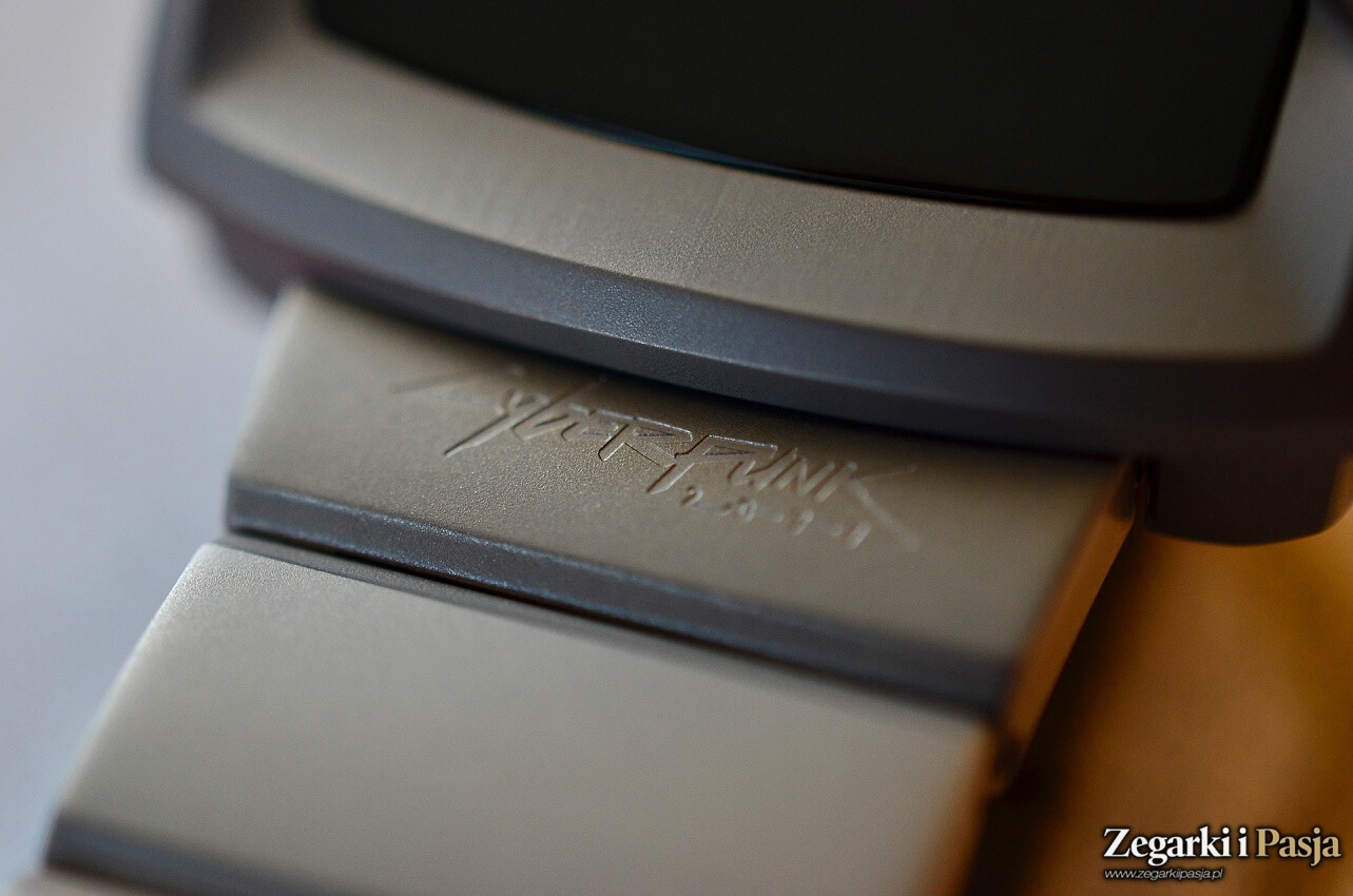 Ogniwa tytanowej bransolety są równej szerokości, poza tymi przy kopercie, które minimalnie rozszerzają się w kierunku gdzie są mocowane. Na pierwszym z nich, po stronie wyświetlacza, możemy zobaczyć wygrawerowane logo gry Cyberpunk 2077. Długość bransolety może zostać od razu dostosowana do kupującego przed wysyłką, oczywiście po podaniu obwodu nadgarstka (jeśli mieści się on w zakresie od 17 cm do 19 cm).