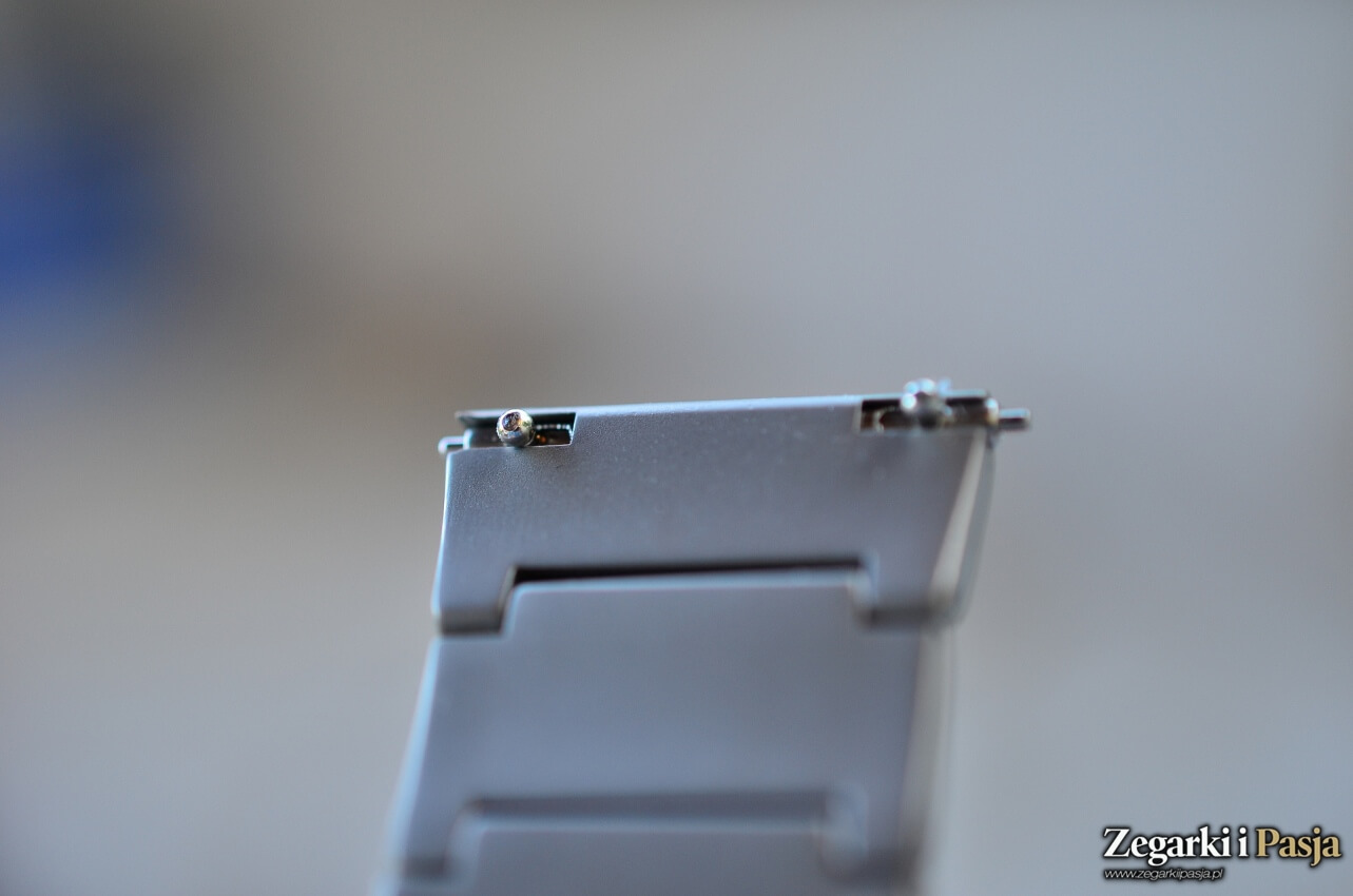 Wracając do opisu zegarka, a dokładnie jego bransolety. Jej mocowanie ma system szybkiej wymiany. Przy każdej z krawędzi jest wypustka pozwalająca na ściśnięcie teleskopów i szybkie zdjęcie bransolety, co z kolei daje możliwość podjęcia próby dopasowania ciekawego paska.