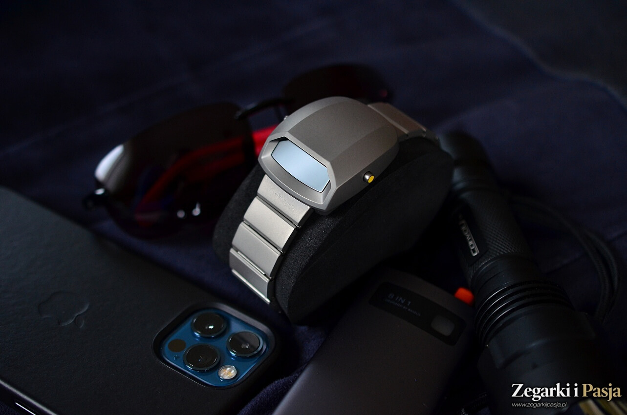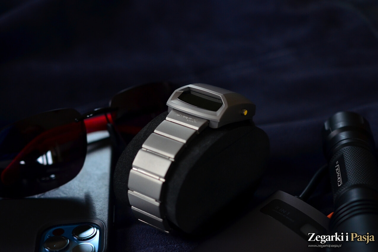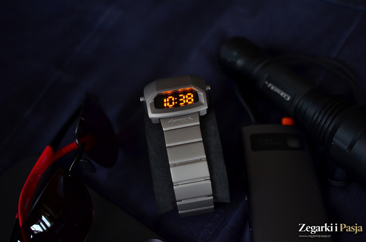 Kluczową cechą wyróżniającą, poza wyświetlaniem czasu na żółtym, ledowym ekranie, jest wygląd tego zegarka. Koperta ma bardzo specyficzny kształt. Nie jest skomplikowana pod względem technicznym czy stylistycznym, niemniej nie ukrywam, iż mam trudności z jej opisaniem. Bez problemu natomiast widzę ją w realiach przyszłości, w dystopijnym wydaniu, zaułkach Night City, jak i innych metropoliach przyszłości w mrocznej wersji.