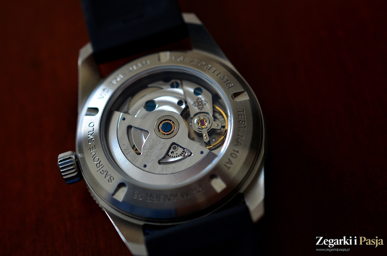 Po odwróceniu zegarka na drugą stronę ukazuje nam się trójpłaszczyznowy dekiel, wkręcony w krótki kołnierzyk koperty. Stalowa część dekla to dwie płaszczyzny o szczotkowanej powierzchni, gdzie na tej bliżej środka wygrawerowano podstawowe informacje o tym modelu zegarka w języku czeskim. Część płaska ma przeszklenie szkłem z nałożoną powłoką antyrefleksyjną. Widzimy przez nie czeski manufakturowy mechanizm Prim Kalibr 95.