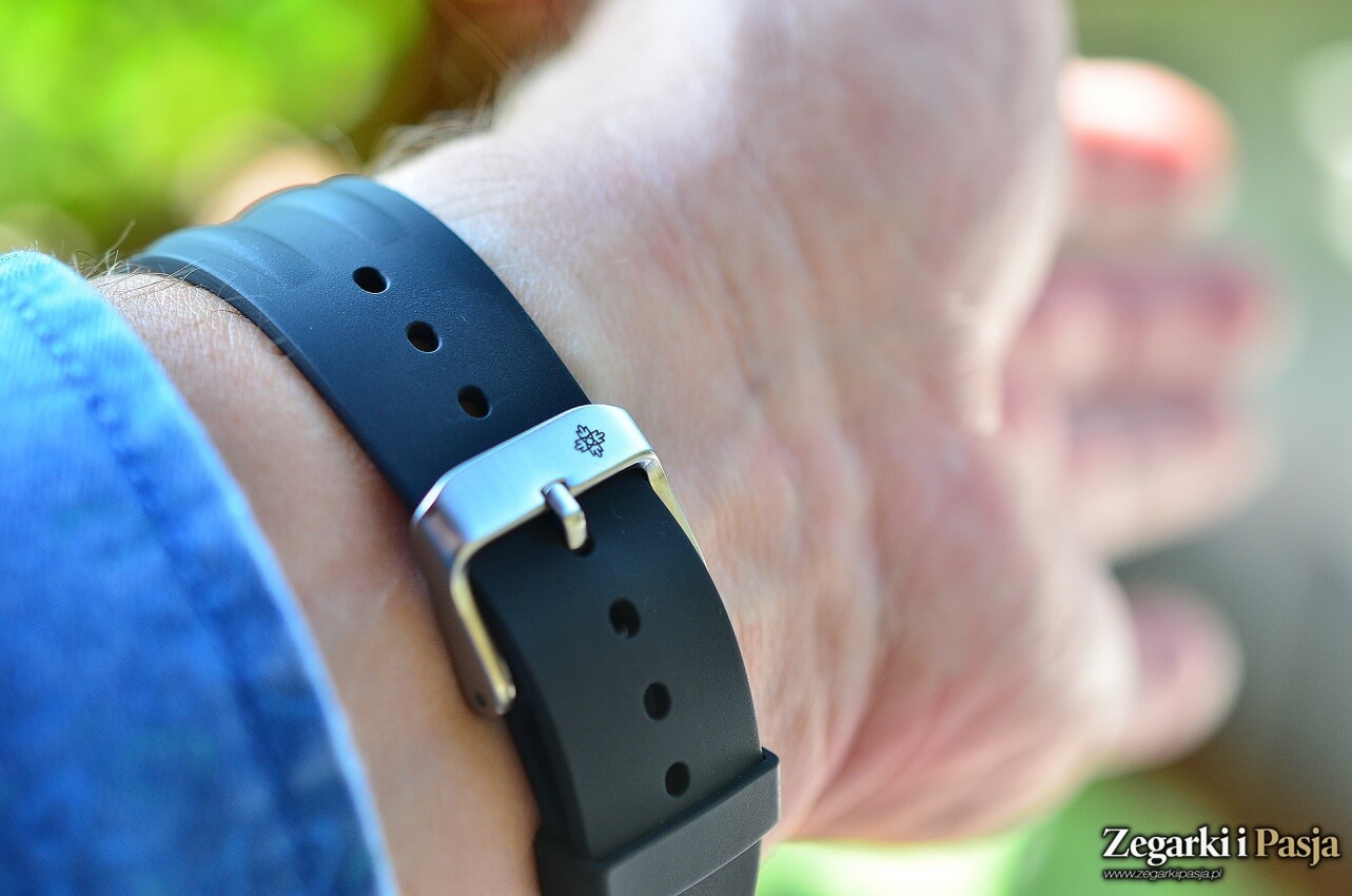 Zegarek otrzymujemy na bardzo miękkim, wygodnym już od momentu założenia gumowym pasku. Jest on czarny, bardzo przyjemny w dotyku, oraz wygodny w użytkowaniu. Zapięcie to standardowa klamra z pinem, która w tym przypadku doskonale pasuje do konwencji.