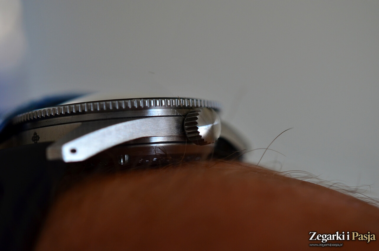 Po prawej stronie obudowy, na godzinie 3., umieszczono koronkę. Jest ona całkiem wygodna w obsłudze, choć niezbyt duża. Koronka jest zakręcana. Dość łatwo łapie gwint, ale trzeba proces dokręcania rozpocząć z wyczuciem. Koronka jest chyba jedynym elementem, od którego oczekiwałbym więcej. Zegarek tej klasy, wykonywany w manufakturowy sposób, o relatywnie wysokiej cenie, ten element ma nieco niedopracowany. Koronka wprawdzie jest bardzo dobrze wykonana – ma równe ząbki na jej bokach, ostre krawędzie, ale na czołowej powierzchni nie ma nic, poza okrężnym szczotkowaniem.