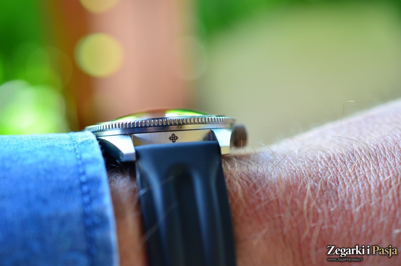 Średnica koperty, jak wspominałem, to 38 mm, ale nie jest to zegarek, który można określić mianem „maluszek”, gdyż jej wysokość od ucha do ucha to już 49 mm, czyli całkiem sporo. Do tego dochodzi luneta – jej fragment pokryty drobnymi ząbkami wystaje poza obrys, co daje nam już średnicę wynoszącą 39,55 mm. Taki zabieg stylistyczny nie tylko optycznie, ale także realnie i odczuwalnie czyni ten model większym. Pewne dlatego właśnie, zegarek ten pasuje także mnie, mimo, że wolę większe czasomierze.