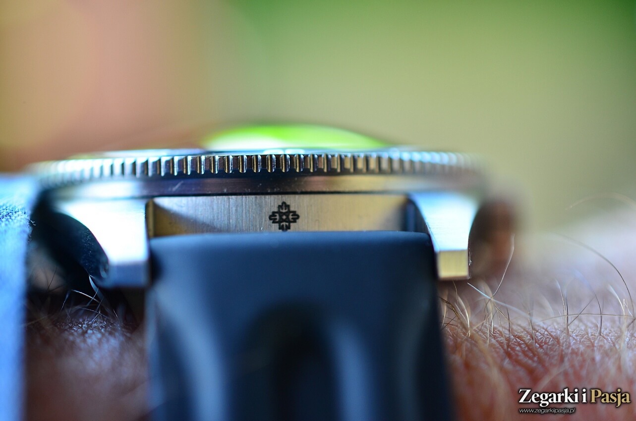 Idźmy dalej. Od góry kopertę wieńczy wspomniana luneta. W dolnej części ma ona średnicę koperty. Wyżej rozszerza się, dając ząbkowany obwód zapewniający jej łatwy chwyt. Od góry ma ona czarną wkładkę, o lekko wklęsłej powierzchni, z jakby zatopioną skalą minutową co 5. Na przemian to delikatne kreski i oznaczenia cyframi arabskimi. Okala ona dodatkową, nieruchomą, stalową lunetę w której zamocowano szkło. Położenie obrotowej części ustala wypustka o kształcie trapezu krótszą podstawą skierowanego do wewnątrz. Wkomponowano w ten element punkt z masą luminescencyjną.