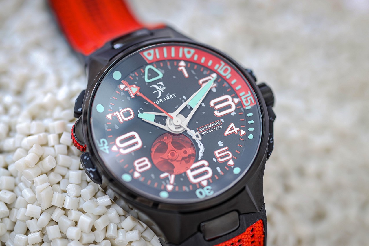 Model ten ma co najmniej kilka wyjątkowych cech, jak chociażby zastosowanie do jego produkcji różnych komponentów, które są wykonane z przetworzonych tworzyw sztucznych znalezionych w oceanach. Paski wykonano z bio-gumy i nylonu z recyklingowych sieci rybackich. Osłona elementu, koła zębatego, widocznego po lewej stronie koperty na godzinie 9.30, nazwijmy go „pokrętłem” – napiszę o nim dalej, jak i koronki są wykonane z przetworzonych elementów wyłowionych z oceanów.