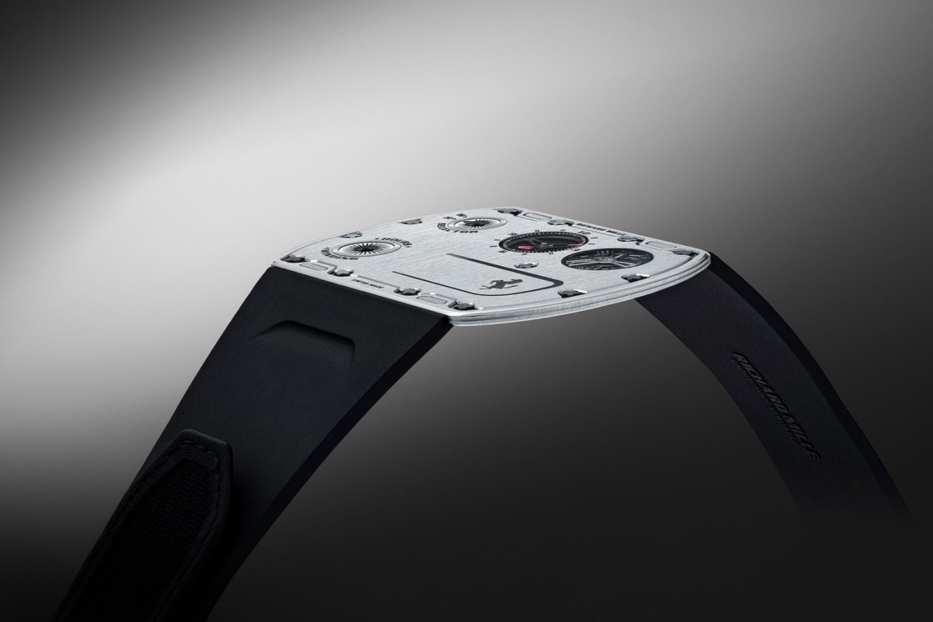 Grubość całego zegarka – 1,75 mm – to najnowszy rekord wśród czasomierzy mechanicznych. Żeby osiągnąć takie parametry, marka Richard Mille opracowała mechanizm o grubości 1,18 mm. Dla porównania: poprzedni rekordzista – Bulgari Octo Finissimo Ultra ma mechanizm o grubości 1,5 mm. Różnica między wartościami tych elementów jest więc większa niż dla gotowych zegarków. Wynika to z faktu, że w zegarku Bulgari płyta nośna mechanizmu pełni jednocześnie funkcję dekla – elementu koperty – a zegarek RM UP-01 ma standardową konstrukcję.