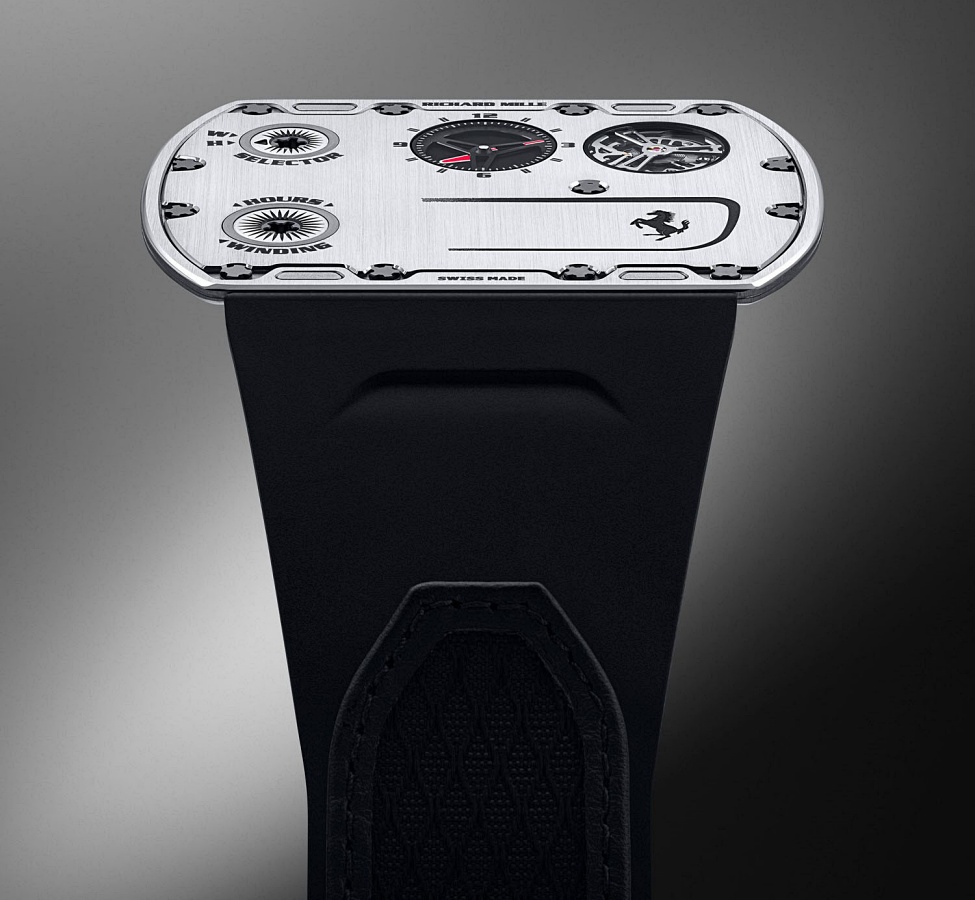 Jego kształt możemy określić jako tonneau, ale w trochę innych proporcjach niż tradycyjna, beczułkowata koperta – szerokość RM UP-01 Ferrari jest większa niż jego wymiar od ucha do ucha. Tych ostatnich co prawda tutaj nie uświadczymy w typowej formie – zapinany na rzep pasek jest bowiem w specjalny sposób przytwierdzony do koperty.