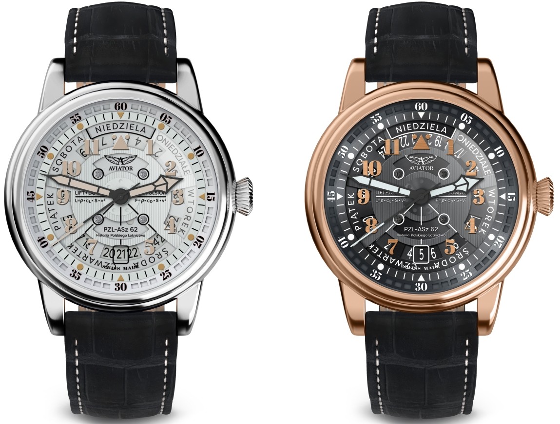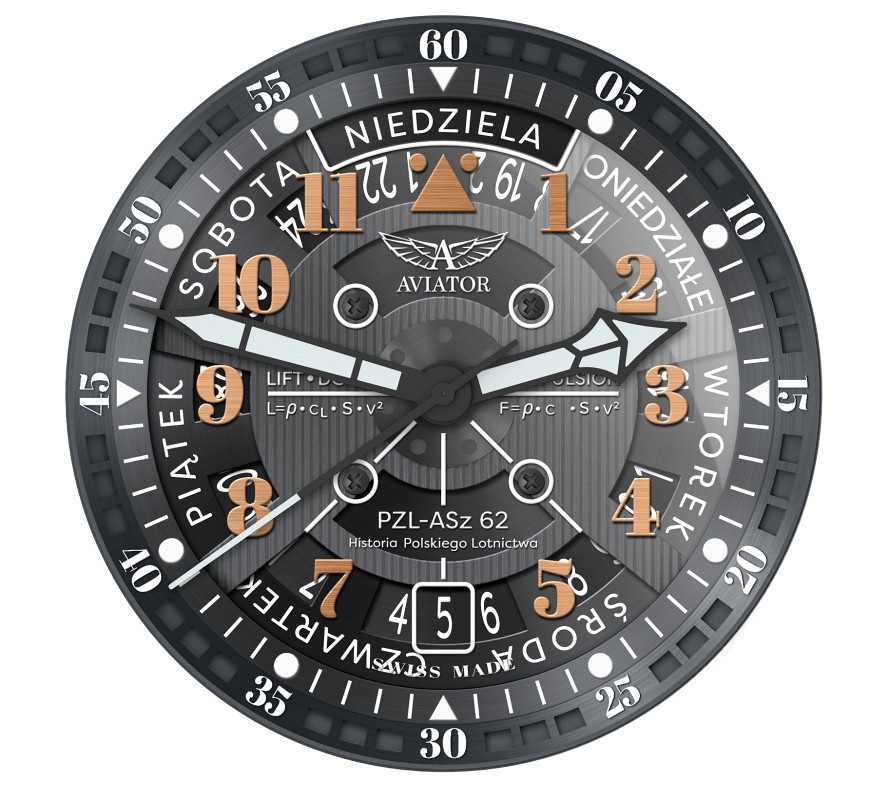 Pierwsza jest w modelu ze złocistą kopertą, a druga w zegarku ze standardowej stali. Tarcze mają sporo elementów stylistycznych. Jak wspominałem, ma budzić ona skojarzenia z samolotowym gwiazdowym silnikiem, konkretnie silnikiem PZL ASz-62 zmodyfikowanym do samolotu Douglas DC-3 przez Andrzeja Frydrychewicza. Na bardziej zewnętrznej części tarczy, na ukośnie ustawionym pierścieniu, zamieszczono stylizowaną skalę minutową z oznaczeniami cyframi arabskimi co 5 i prostokącikami pomiędzy nimi, gdzie przerwy między nimi oznaczają kolejne minuty. Bliżej środka skale zdublowano punktami i kreskami.
