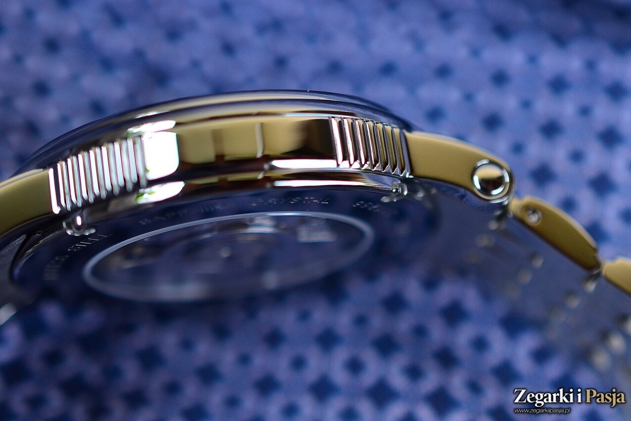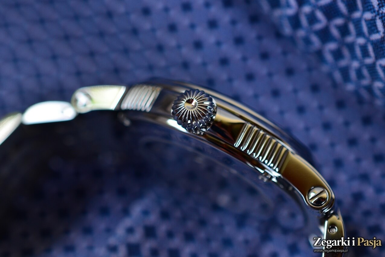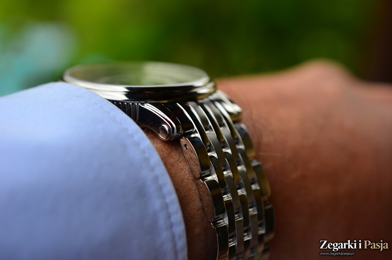 Czyli zegarek na stalowej bransolecie. W tym wydaniu jest to 7-rzędowa, stalowa bransoleta z 3. i 5. rzędem wąskich ogniw, które są szczotkowane, wyróżniając się pośród pozostałych pięciu polerowanych rzędów. Zapięcie to składana klamra typu motylkowego, ze schodzącymi się polerowanymi zakończeniami bransolety. Na jednym z nich wygrawerowano nazwę marki.