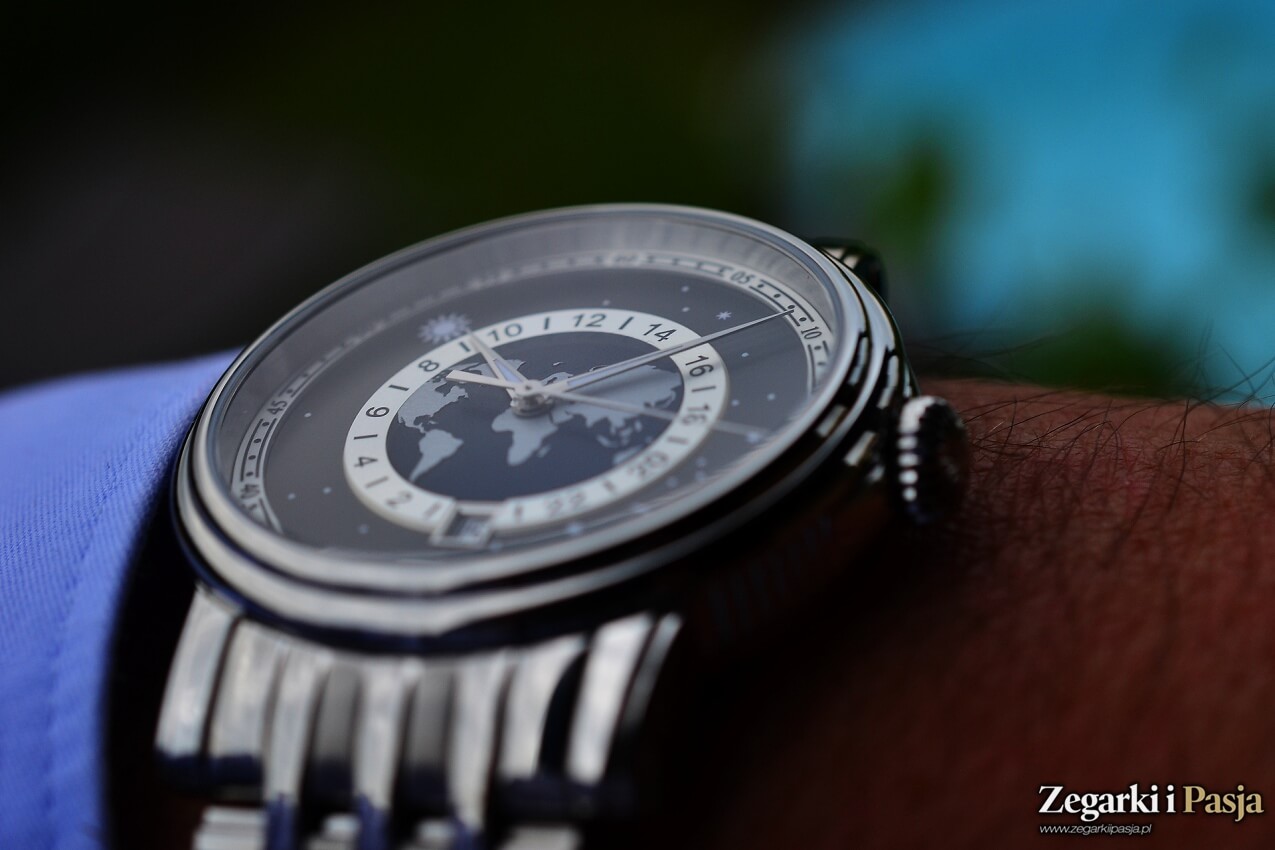 Nad koniecznością zastosowania tego wskazania bym się zastanowił. Na szczęście nie burzy ono harmonii układu elementów na tarczy, więc jedynie zwrócę na nie uwagę. I ten ostatni okrąg otacza wewnętrzną część tarczy. To mapa świata. Kolor granatowy symbolizuje wody mórz i oceanów, a lądy są wyróżnione barwą srebrzystą, ale i dodatkowo tym, że nieco wystają ponad granatową powierzchnię cyferblatu, stwarzając odczucie trójwymiarowości.