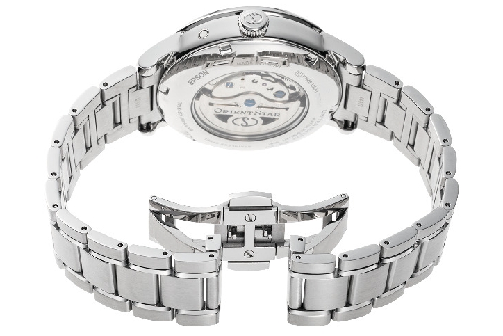 Marka Orient Star w tym nowym modelu wykorzystała nie tylko fakt, że zastosowany mechanizm oferuje dodatkowe funkcje, takie jak wskazanie rezerwy chodu i faz Księżyca, ale zagospodarowała w atrakcyjny sposób również pozostałą część tarczy.