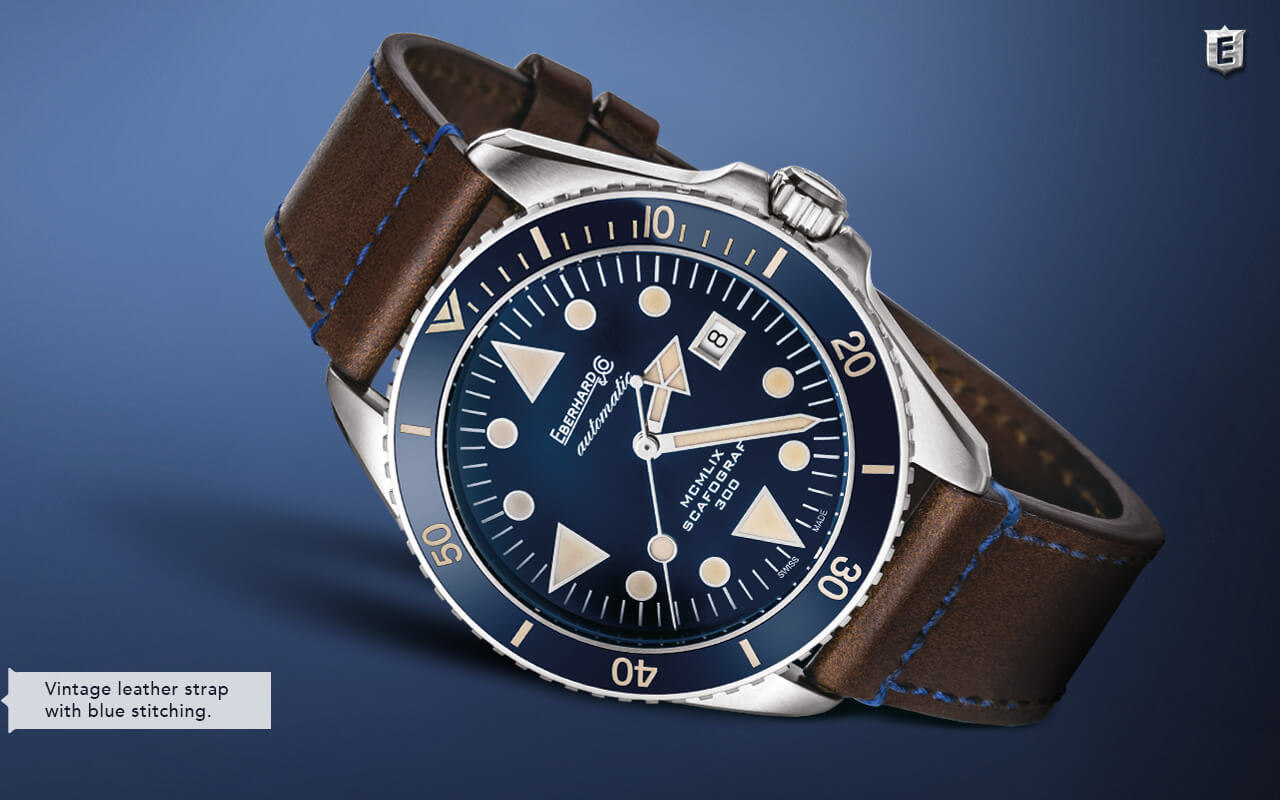 Pierwsze, co przykuwa wzrok, gdy patrzymy na ten zegarek, to piękny niebieski odcień bijący z jego tarczy. Jak wspomniałem, marka Eberhard & Co zaprezentowała model Scafograf w 1959 roku, mając na celu zaspokojenie rosnącego zapotrzebowania na zegarki nurkowe.