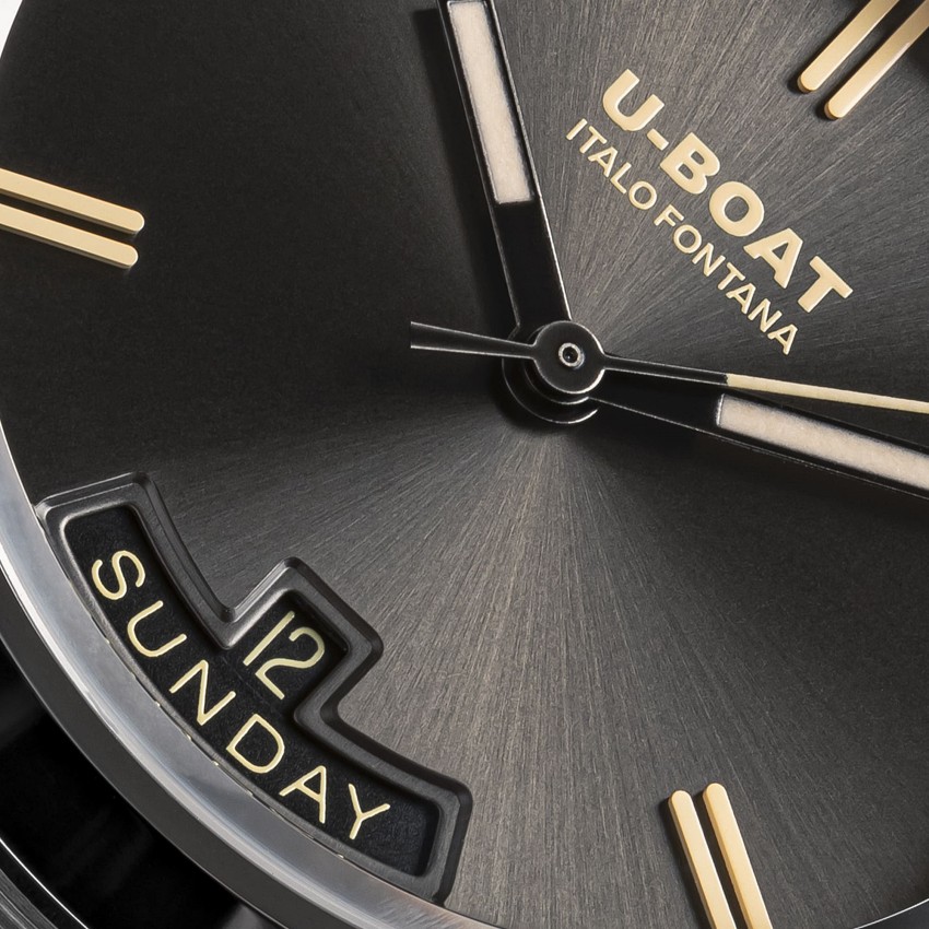 Charakterystyczna, widoczna po lewej stronie zakręcana obudowa korony osłania koronkę nastawczą, a koperta posiada wodoszczelność na poziomie 10 atmosfer, czyli 100 metrów w warunkach statycznych. Sercem zegarka jest szwajcarski mechanizm STP, spersonalizowany pod szczegółowe wytyczne U-BOAT. Oprócz komplikacji day-date oferuje 44-godzinną rezerwę chodu. Dzięki Super-LumiNovej na wskazówkach godzinowych, bez większego trudu odczytamy godzinę także w nocy.