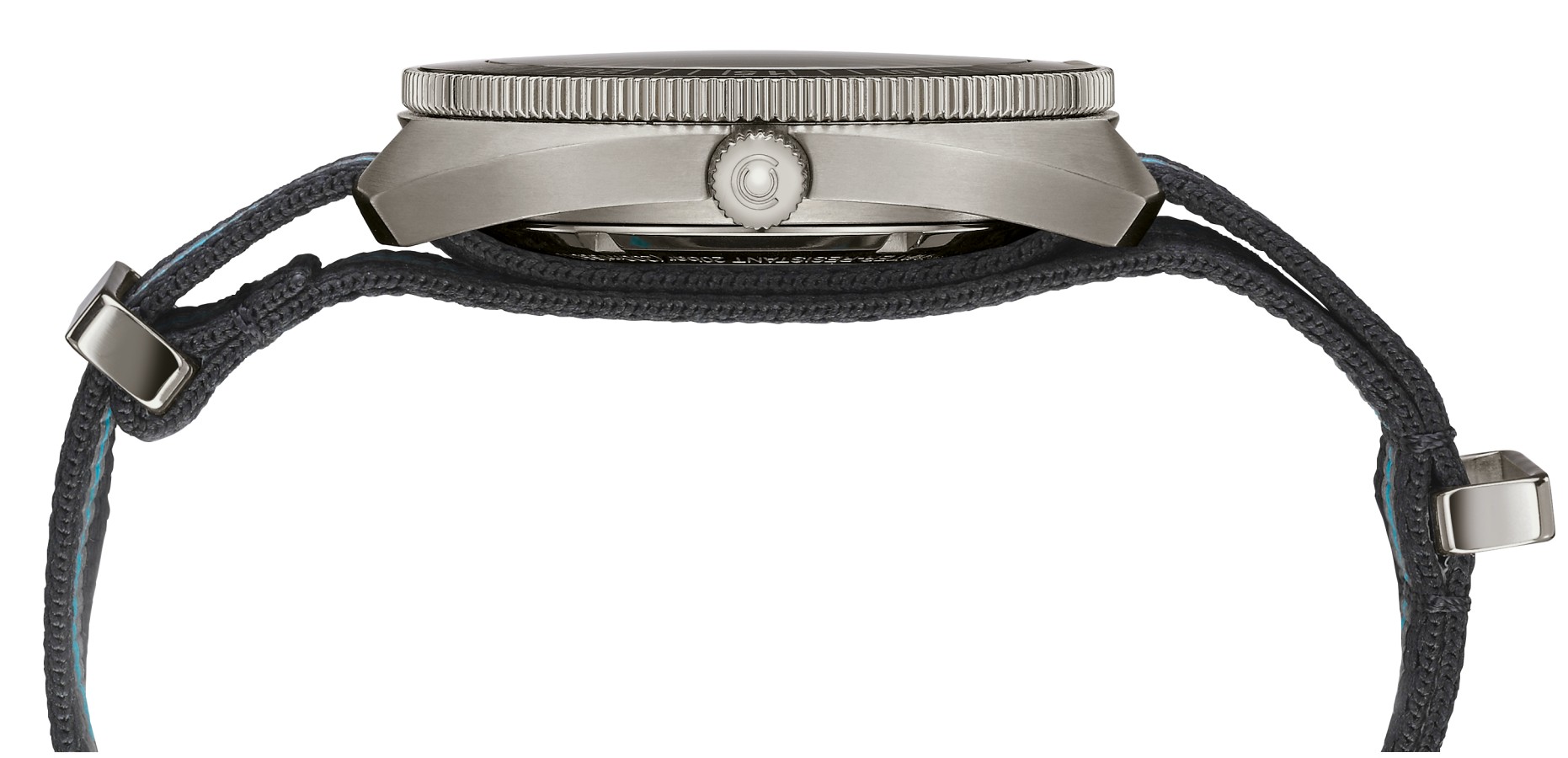 Matowa, czarna tarcza pasuje idealnie do prostokątnych wskazówek i indeksów z powłoką Super-LumiNova®. Ta specjalna edycja jest dostępna z prążkowanym szaro-niebieskim paskiem tekstylnym wykonanym z materiału #tide ocean material z tytanowym zapięciem.