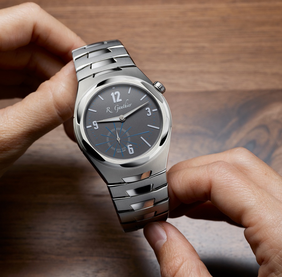 Pierwsza metalowa bransoletka Romaina Gauthiera jest wykonana w całości z naturalnego tytanu klasy 5, lekkiego i wygodnego. Ta bransoletka została zaprojektowana tak, aby nosząca ją osoba nie czuła jej na nadgarstku; oprócz tego, że jest lekka, jest również bardzo cienka, dzięki składanemu zapięciu zintegrowanemu z bransoletą. Sama bransoletka jest zintegrowana z kopertą za pomocą lekko zakrzywionych uszu, które dopasowują się do naturalnego kształtu nadgarstka. W tym samym celu ogniwa są przegubowo i precyzyjnie montowane, aby dostosować się do wszystkich typów nadgarstków.