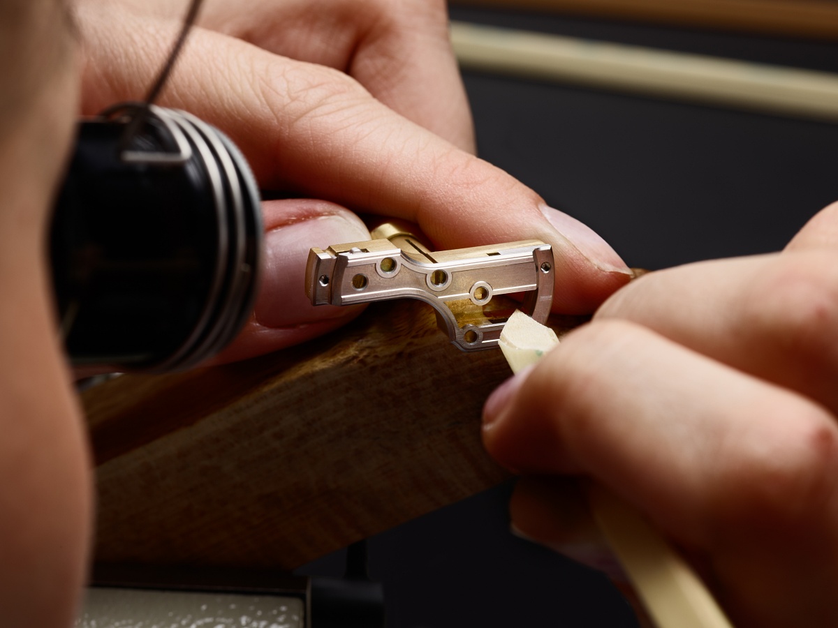 Podobnie jak elementy koperty i tarcza zegara C by Romain Gauthier Titanium Edition Bracelet, mostki są wykonane z lekkiego, naturalnego tytanu klasy 5, a dzięki różnorodnym wykończeniom mają kontrastujące odcienie i tekstury. Zewnętrzne krawędzie każdego mostka mają podwójną fazę, podczas gdy płaskie powierzchnie mostka i rubiny są otoczone wypukłym obramowaniem o prostych ziarnach. W tych granicach specjaliści od ręcznego wykańczania w Manufakturze Romain Gauthier zastosowali specjalną technikę ręcznego grawerowania, aby stworzyć bardzo oryginalną teksturę z wgłębieniami. Płyta główna mechanizmu pod spodem została ręcznie zmatowiona.