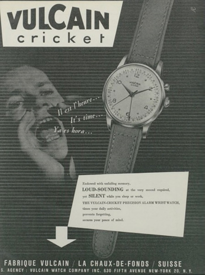 W 1947 roku światło dzienne ujrzał model, z którym marka Vulcain jest do dziś kojarzona najczęściej, czyli posiadający funkcję alarmu, naręczny zegarek o nazwie „Cricket”.