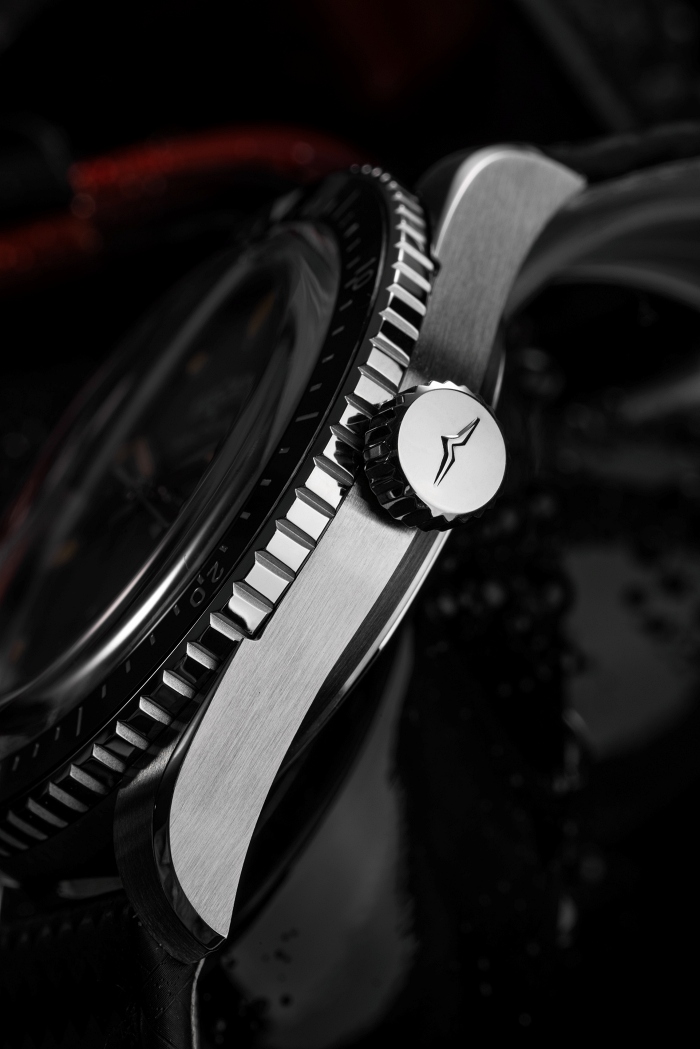 Koperta jest wykonana ze stali, a jej powierzchnie zostały wykończone głównie poprzez szczotkowanie. Choć znajdziemy też elementy polerowane, jak krawędzie uszu, ranty obrotowej lunety, czy koronka. Ta ostatnia jest dodatkowo ozdobiona przy pomocy subtelnego logo marki, umieszczonego na jej czole.