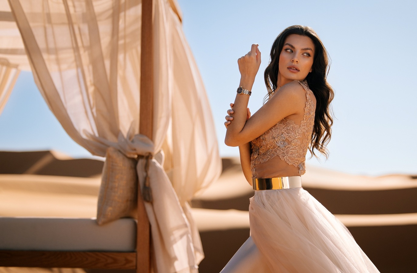 Łagodne i zmysłowe linie kopert przywodzące na myśl piękno pustyni przechodzą również z koperty na bransoletę, co dodatkowo potęguje wrażenie subtelnej spójności.