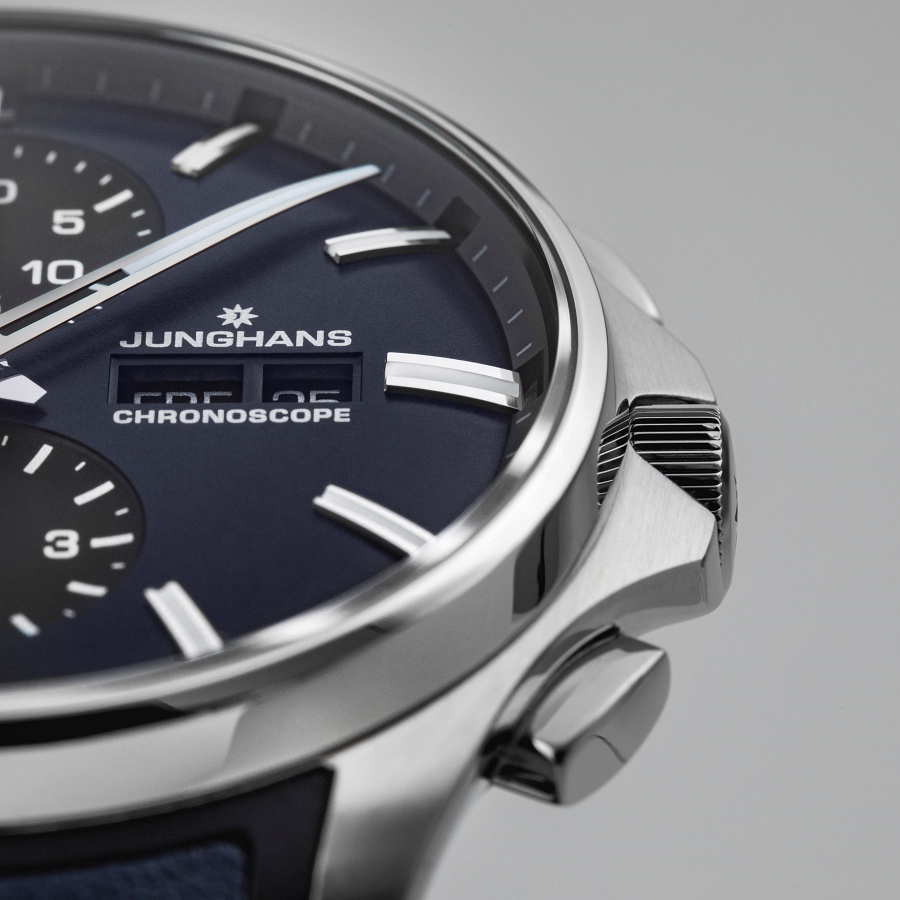 Zegarek Junghans Meister S Chronoscope pod względem wizualnym, biorąc pod uwagę to, co widzimy parząc na niego od frontu, jest bardzo udanym połączeniem klasycznego kształtu, zagiętej tarczy, i prostej, ale czytelnej formy z nowoczesnym stylem sportowym.