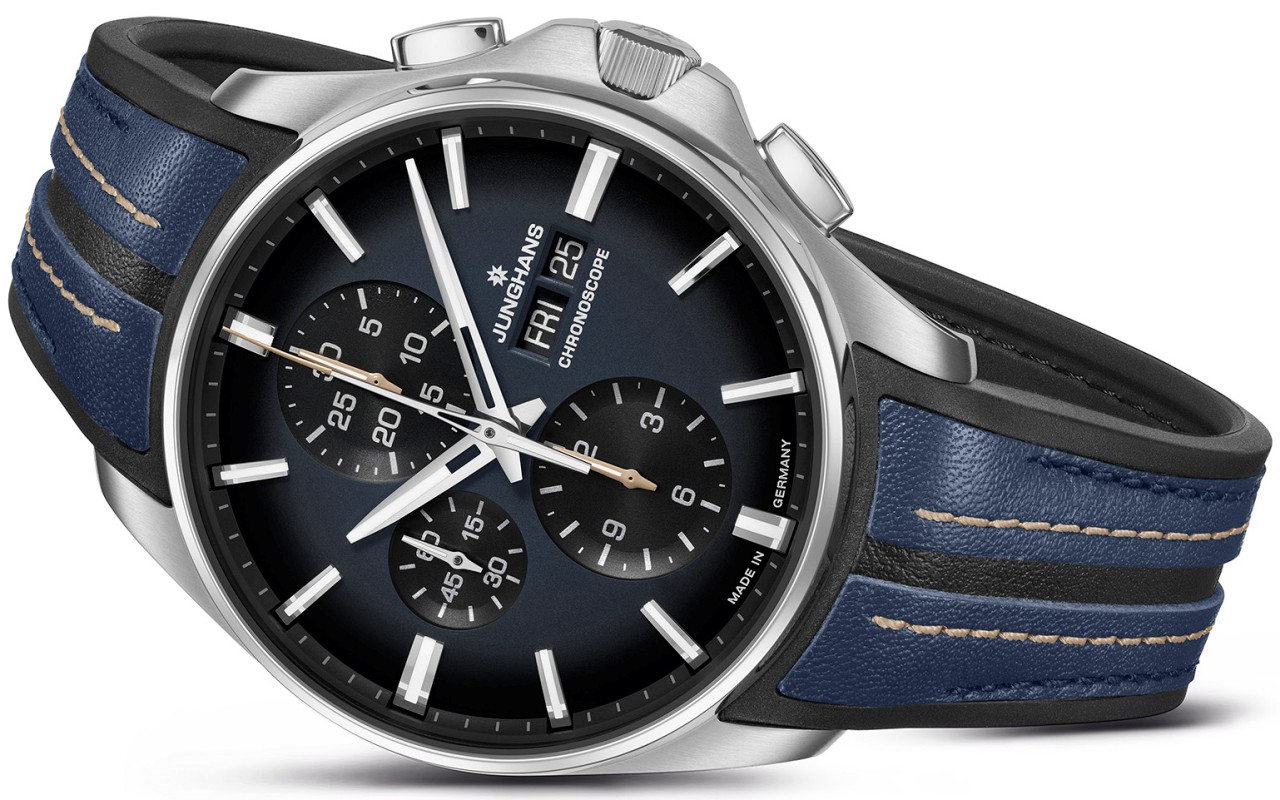 Takie detale, jak nieco masywniejsza koperta, bardzo ciekawe i dopracowane wskazówki wraz z indeksami dają taki właśnie obraz. Wzmacnia go zintegrowany pasek gumowy z wklejonymi od zewnętrznej strony paskami niebieskiej skóry, przeszytej złocistą nicią. Zapięcie paska to wygodna, podwójnie składana klamra. Pasek od spodu ma wytłoczony napis Junghans na dłuższej i Meister na krótszej części.