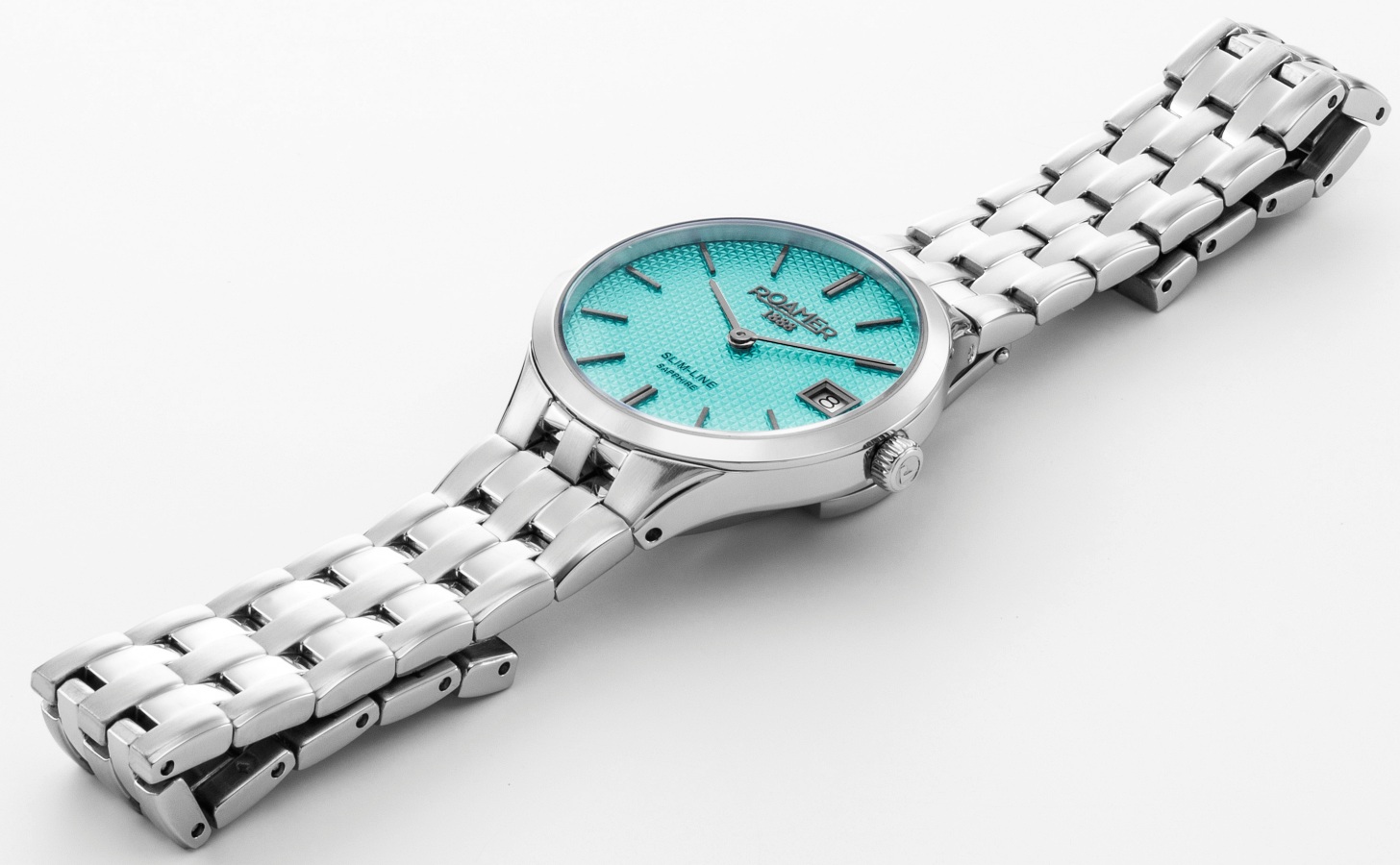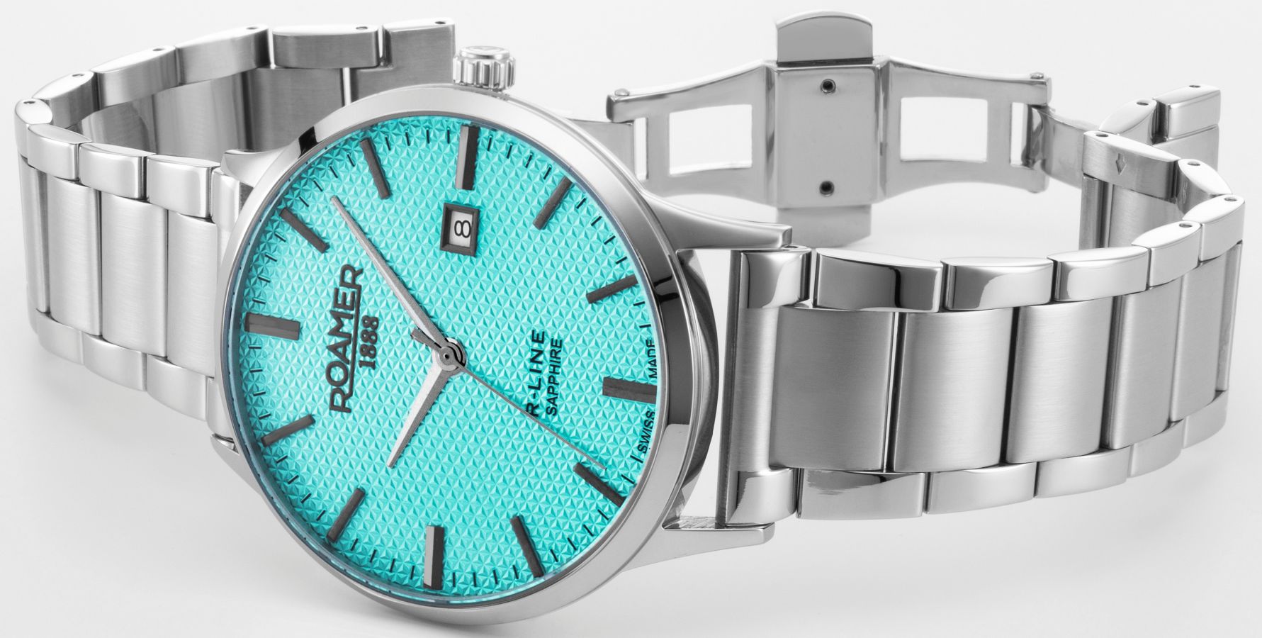 Roamer zaprezentował kilka modeli z tarczą w kolorze, który można by określić właśnie jako Tiffany Blue. No, ale jak wspomniałem, to znak towarowy, więc oficjalnie Tiffany Blue jako nazwa koloru nie wchodzi w grę. Kolor ten jest więc określany jako Sky Blue.