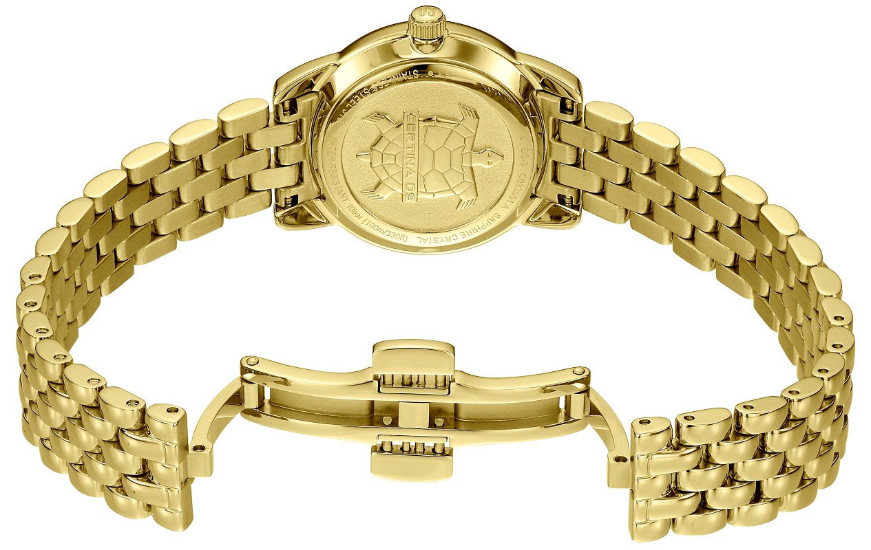 Zegarek ma klasyczną bransoletę, również wykonaną ze stali szlachetnej pokrytej powłoką PVD w kolorze żółtego złota, z zapięciem motylkowym z dwoma przyciskami zwalniającymi.