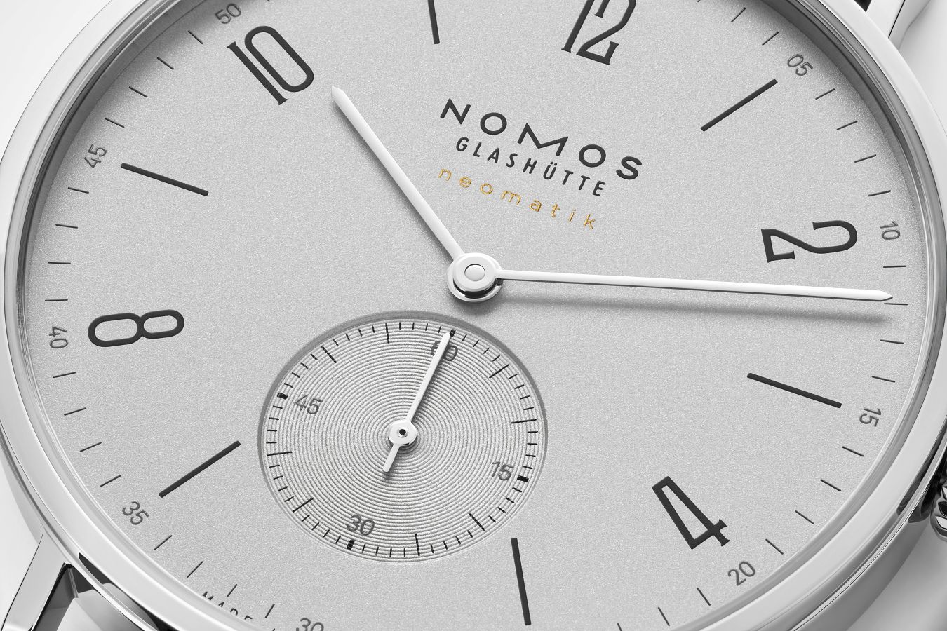 Jak mówi CEO Nomosa: „Platynowa szarość tarczy podkreśla wyjątkowość zegarka, a fakt, że kolekcja Tangente jest elegancka i płaska, nawet z mechanizmem z automatycznym naciągiem, to specjalność Nomosa. To wyjątkowy zegarek, wprost podręcznikowy przykład zegarka garniturowego.”