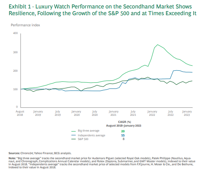 Z raportu wynika, że od sierpnia 2018 roku do stycznia 2023 roku średnie ceny na rynku wtórnym topowych modeli trzech największych marek luksusowych: Rolex, Patek Philippe i Audemars Piguet rosły w tempie 20 proc. rocznie. Dla porównania, giełdowy indeks S&P 500 (w jego skład wchodzi 500 największych giełdowych firm ze Stanów Zjednoczonych) w tym czasie rósł średnio rocznie 8 proc.