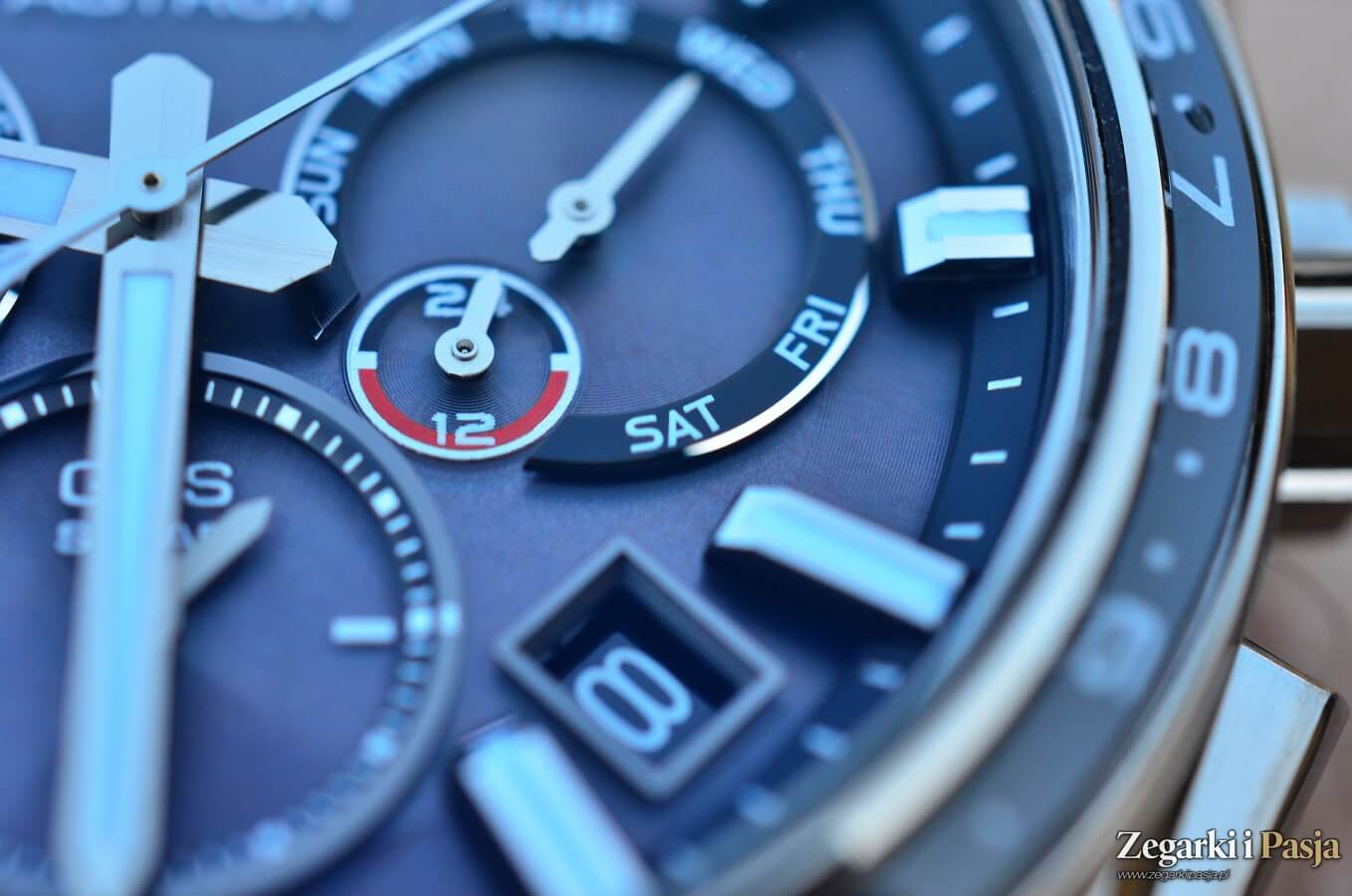 Tarcza na godzinie 3. to tarcza datownika ze wskazaniami dni tygodnia. I na niej jest jeszcze jedna, czwarta mała tarcza, która pokazuje tryb 24-godzinny, dzień i noc, co jest ważnym elementem w sytuacji zmieniania stref czasowych. Na godzinie 4:30 wkomponowano jeszcze okienko datownika, z trójwymiarową ramką, w którym odczytujemy dzień miesiąca wskazywany na czarnym tle.