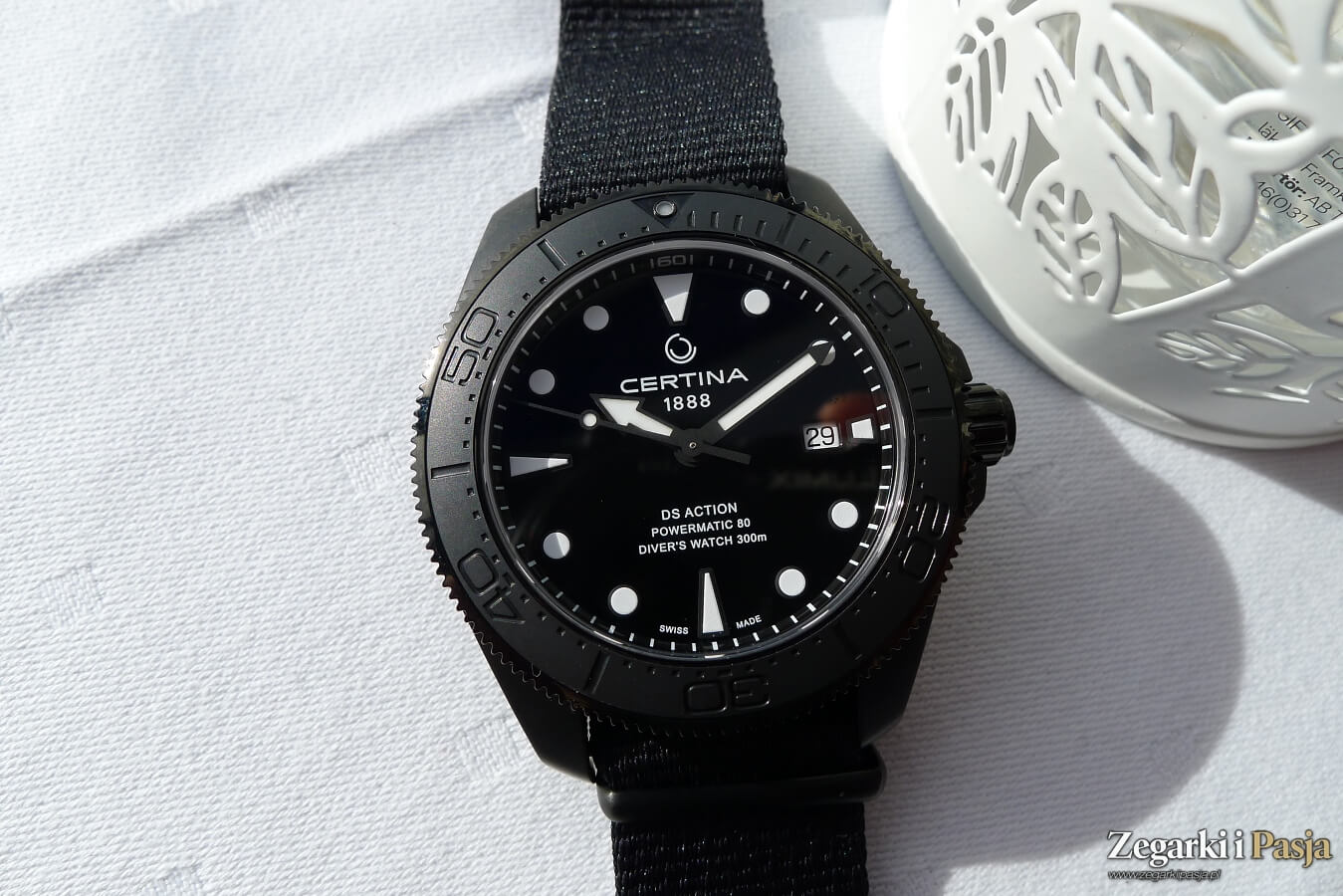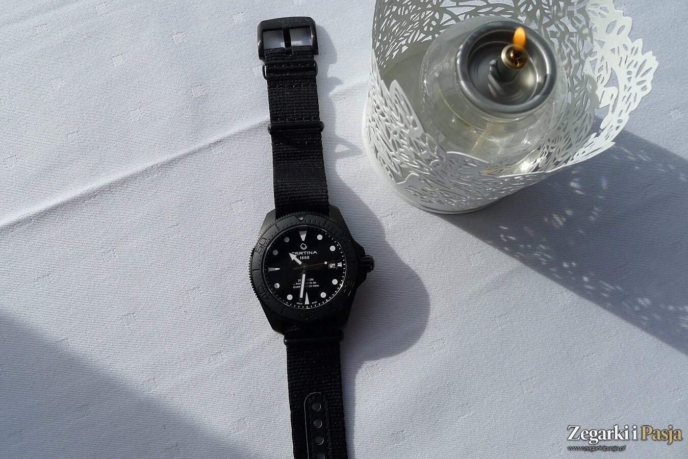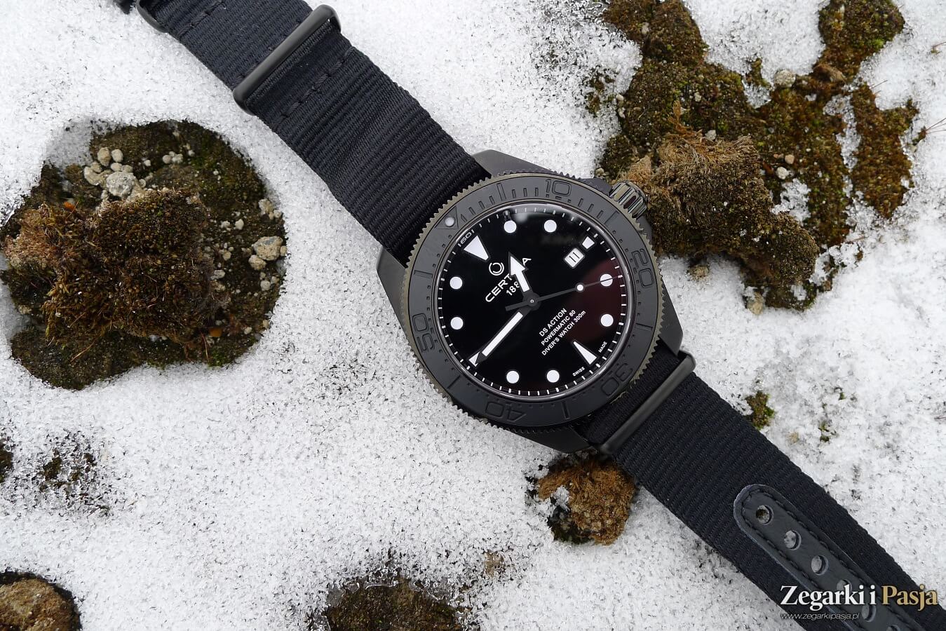 O związkach z morzem przypomina czarny pasek tekstylny typu NATO. Jest on, można powiedzieć, już tradycyjnie w przypadku Certiny wykonany z #tide ocean material®. Ten materiał, tworzony zgodnie z zasadami zrównoważonego rozwoju, powstał z wykorzystaniem plastiku wyłowionego z oceanu. Mając kontakt z paskami tego rodzaju mogę zapewnić, że sprawują się tak dobrze pod względem wygody, jak każdy inny pasek NATO.
