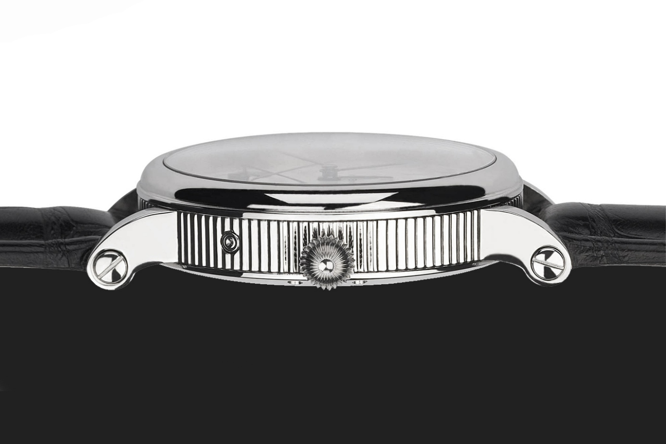 To okrągła koperta i dość szerokie, prostopadle wyprowadzone uszy z otworami do mocowania pasków śrubami. Boki koperty są przyozdobione swego rodzaju użebrowaniem. Zaokrąglona luneta jest polerowana na wysoki połysk. Na godzinie 3. Widoczna jest także bardzo klasyczna, pasująca do całości koronka w stylu cebulki.