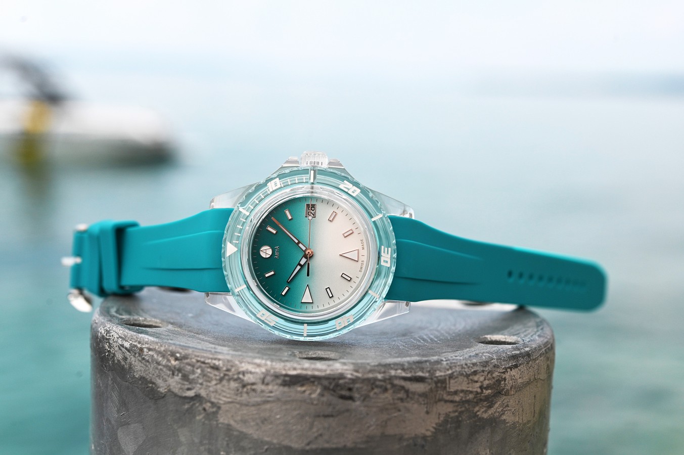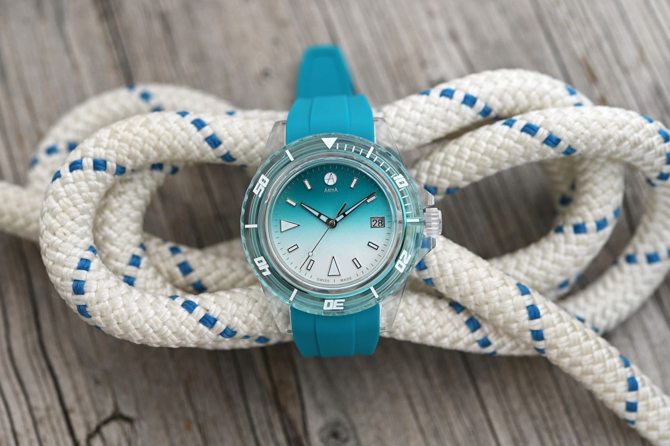 Luneta koperty została stworzona z nowoczesnego materiału o nazwie NanoSzafir, któremu zawdzięcza swój charakterystyczny, turkusowy kolor. Model ArtyA AquaSaphir dostępny jest w dwóch wariantach, także z przeźroczystym pierścieniem. Bez względu na wybraną wersję, na lunetę naniesiono standardową podziałkę nurkową.