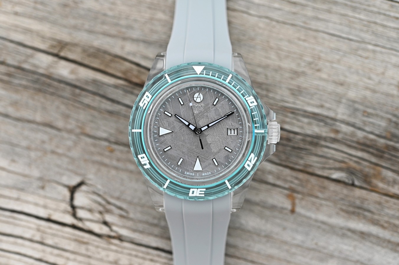 Do wyboru mamy zegarek z tarczą ręcznie wykonaną przez szwajcarskich mistrzów emaliowania, która ma przypominać swoją barwą zmieniający się kolor kolejnych warstw wody podczas nurkowania, bądź też możemy wybrać cyferblat wykonany z meteorytu o nazwie Gibeon odkrytego w Namibii. Jego charakterystyczny wzór nosi nazwę wzoru Widmanstätten.